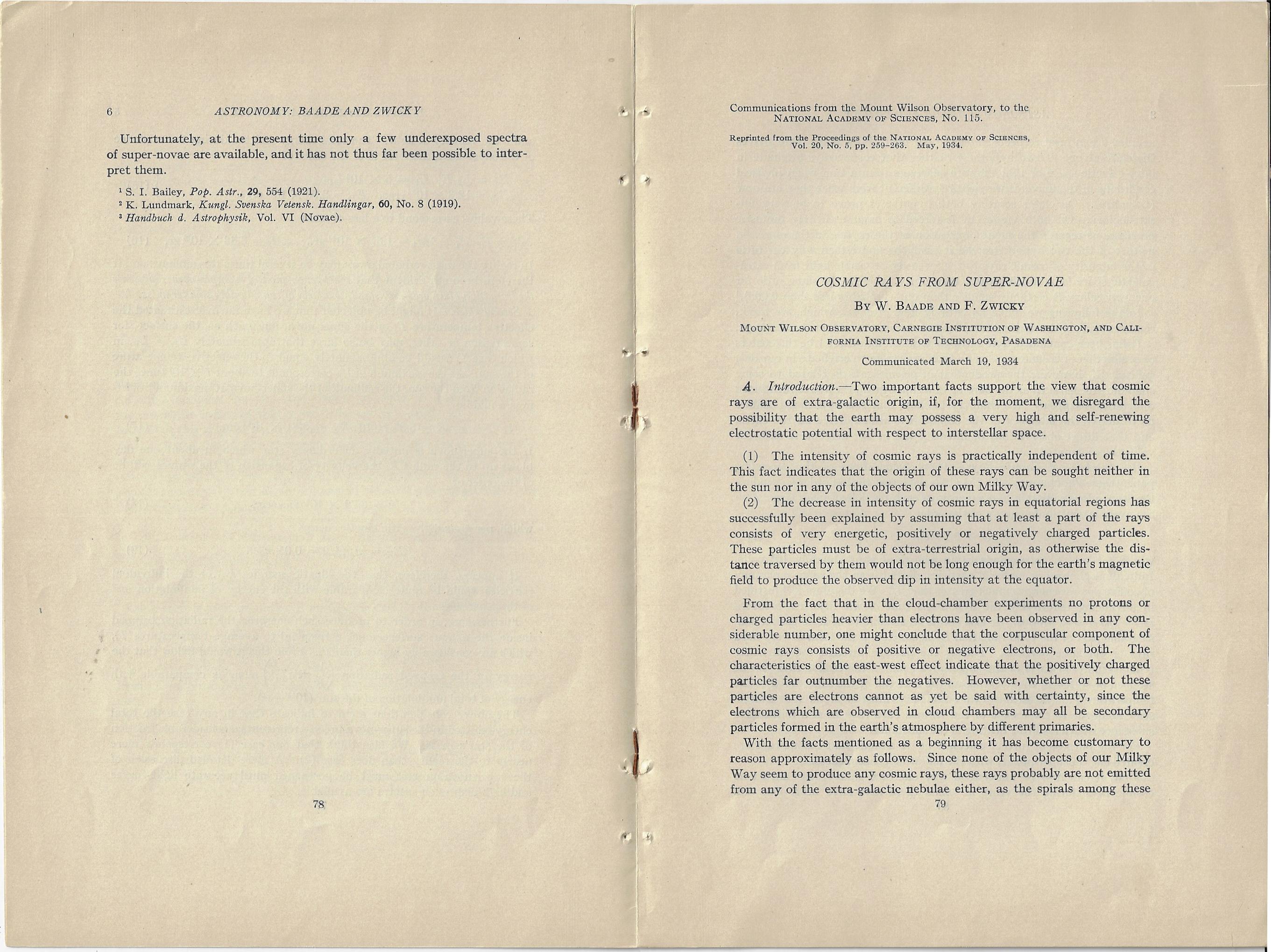 Baade and Zwicky. "Cosmic Ray s from Super-Novae" Communications from the Mount Wilson Observatory, to the National Academy of Science, No. 115, "reprinted from the Proceedings of the National Academy of Sciences", VOL 20, NO 5, PP 259-263, May 1934.
