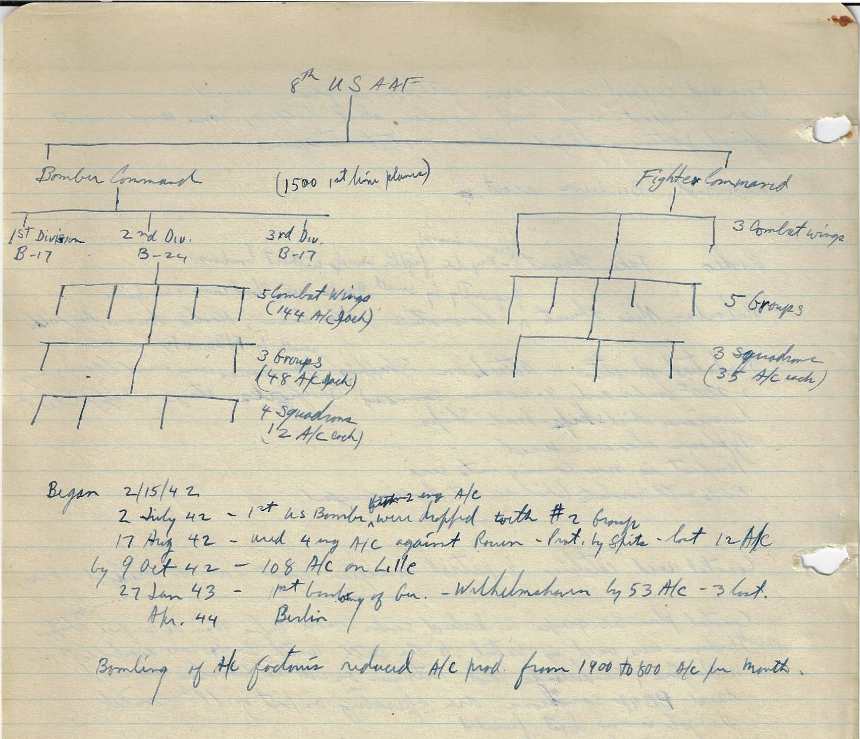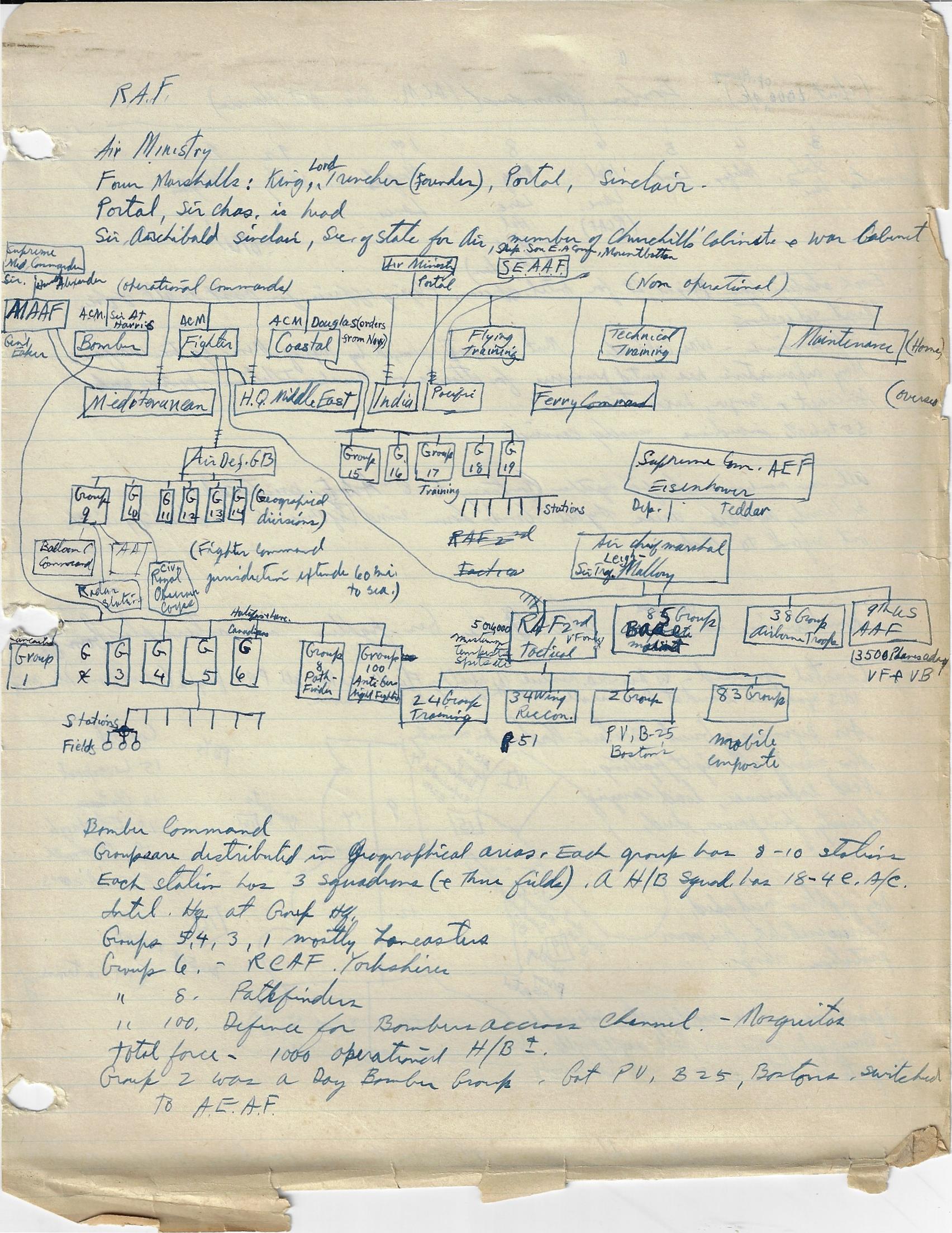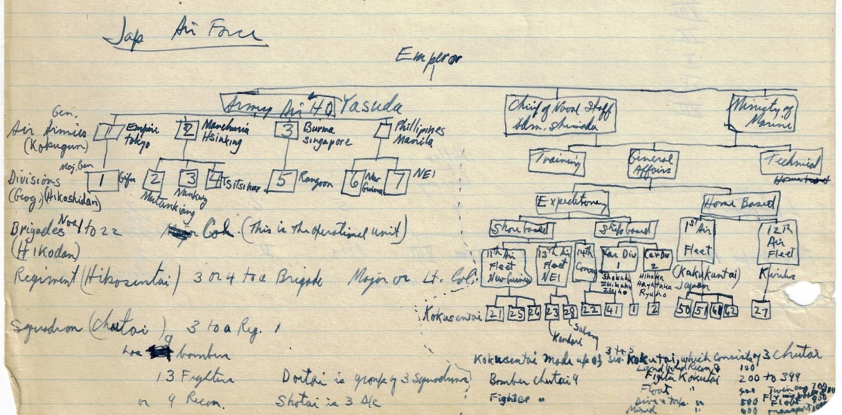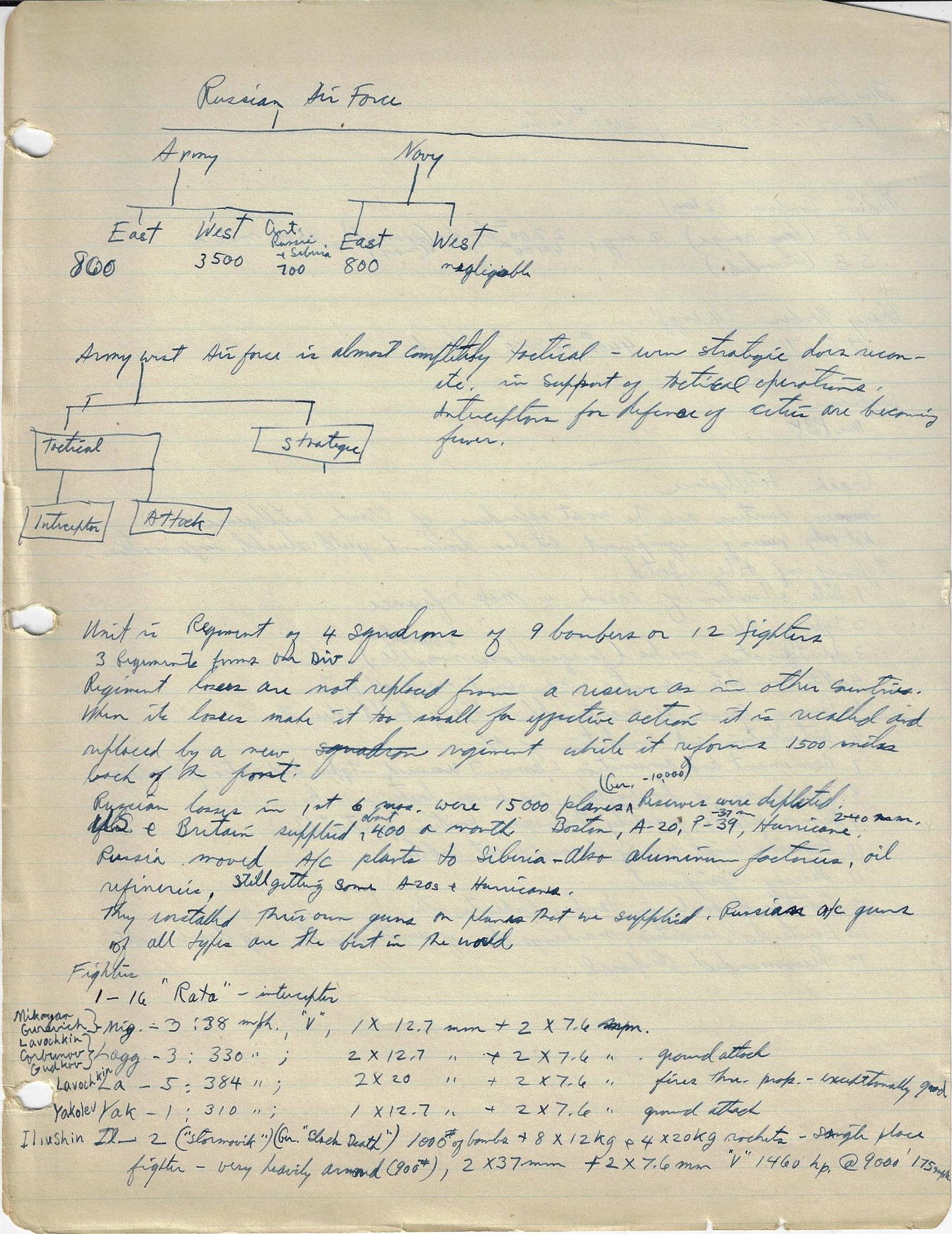 --“Performance of Fighter Command Aircraft”, 26 January 1944. Lists engine, operational ceiling, climb rates, speed, and guns in charts for 34 aircraft. Marked “Restricted”. 3pp. Wonderful data. Accompanied by 12pp of manuscript notes outlining command structure of the Japanese, Russian, German, Italian, and British air forces. (See below for a images.) The air forces outlined in diagrams in the notebook include the U.S. Army Air Force, the Luftwaffe, the air forces of the Soviet Union, and the air force of the Imperial Army of Japan. I'm not saying that these notes are significant, just that they are from an unusual source, and so from that perspective alone they are interesting--that and the fact that the person who made the notes and took the classes became the head of the chief nuclear weapons preparedness organizations in the U.S.