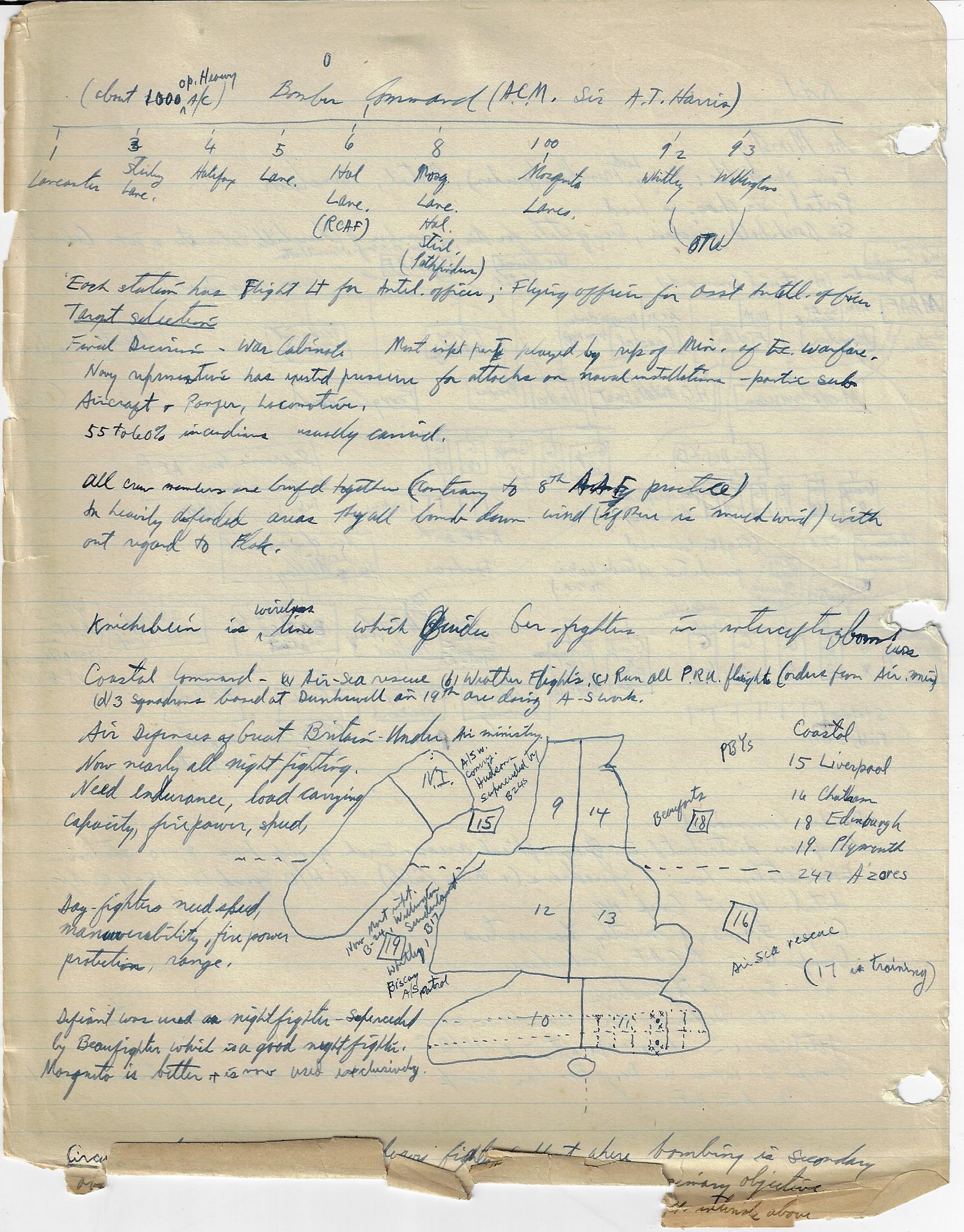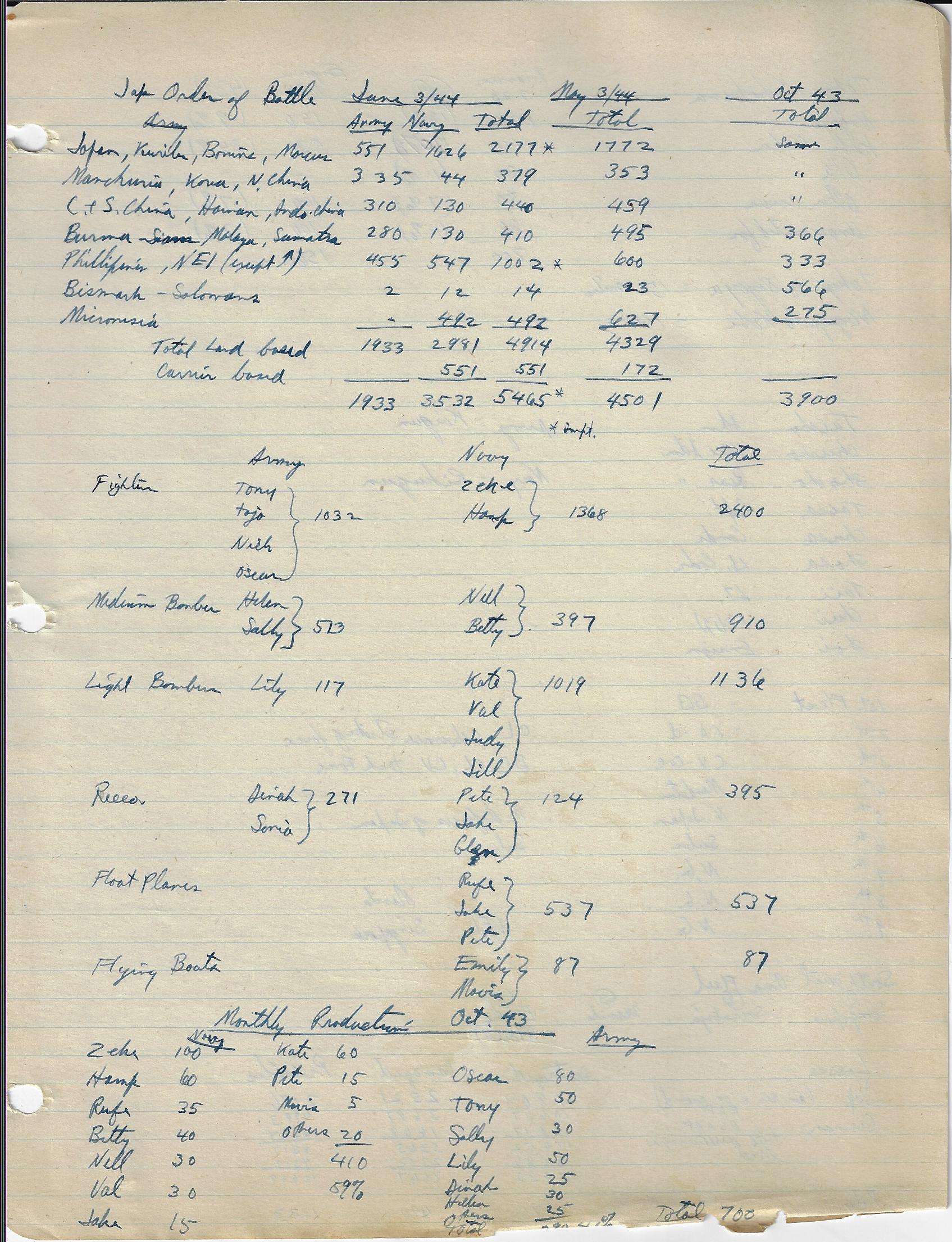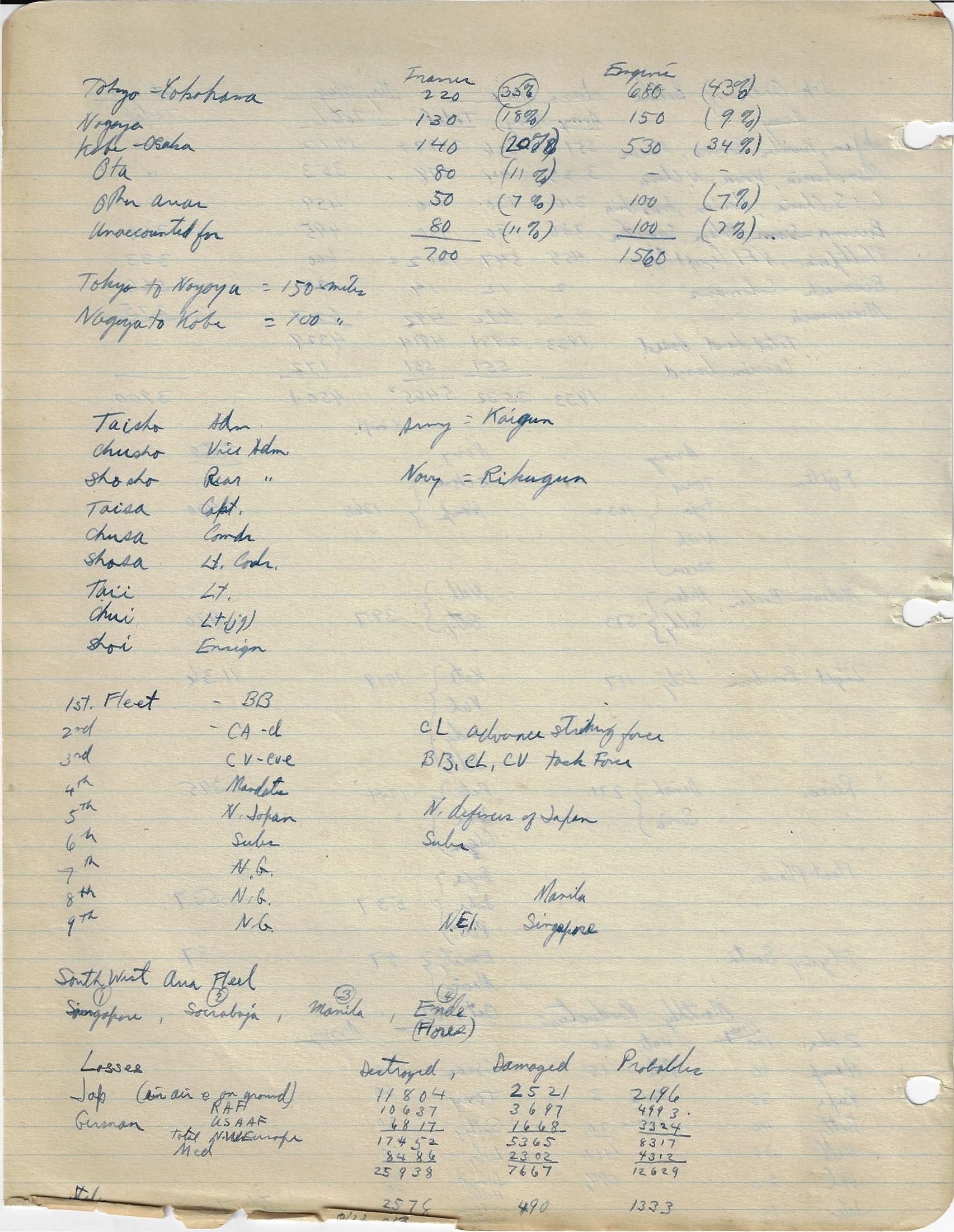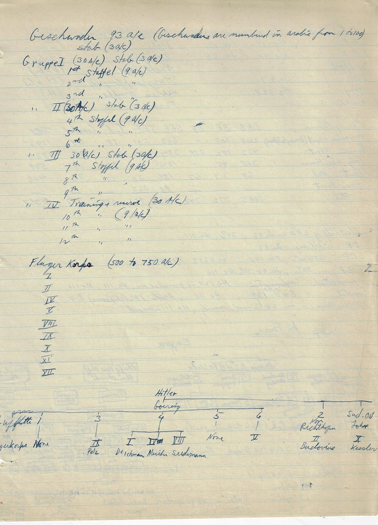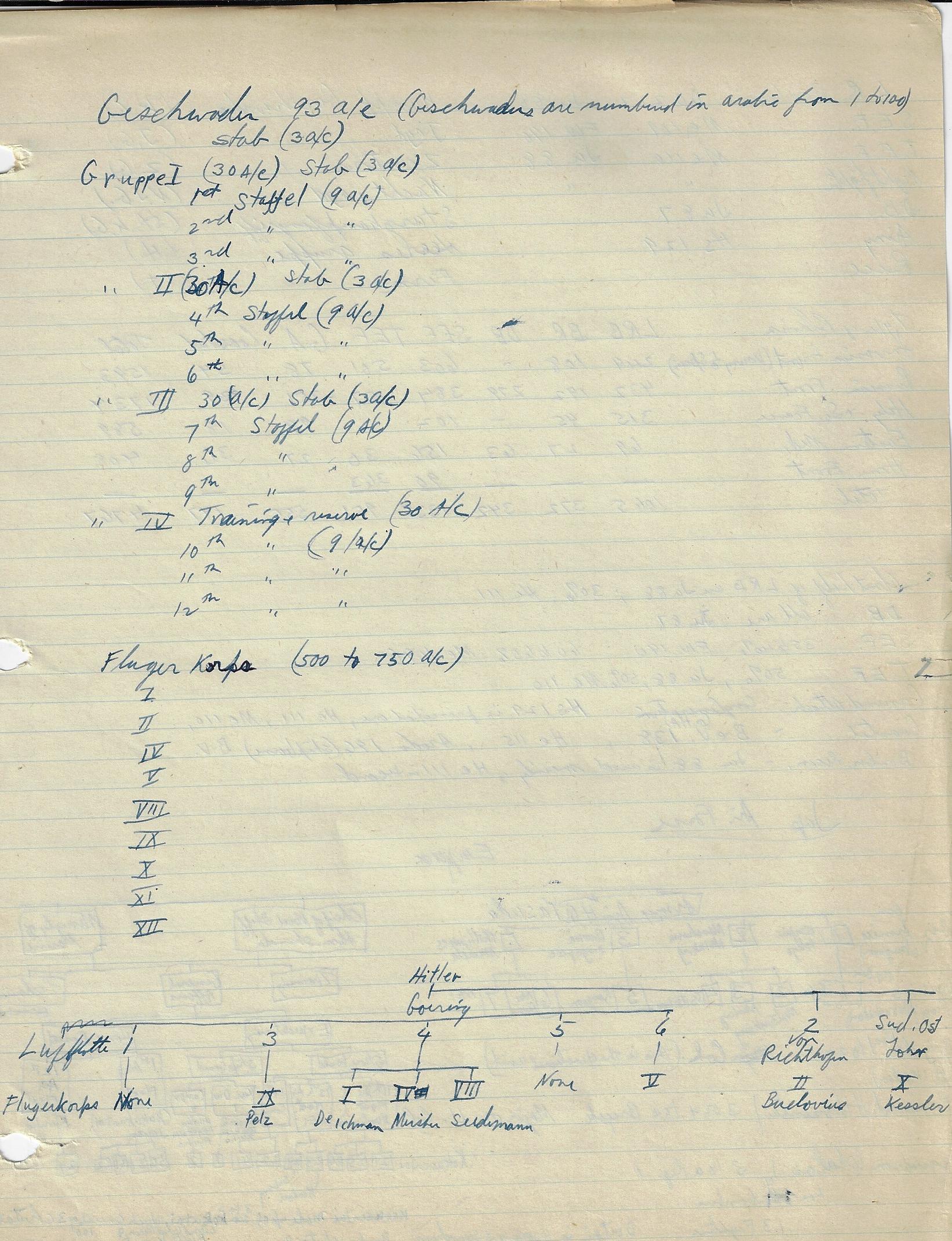 --“Performance of Fighter Command Aircraft”, 26 January 1944. Lists engine, operational ceiling, climb rates, speed, and guns in charts for 34 aircraft. Marked “Restricted”. 3pp. Wonderful data. Accompanied by 12pp of manuscript notes outlining command structure of the Japanese, Russian, German, Italian, and British air forces. (See below for a images.) The air forces outlined in diagrams in the notebook include the U.S. Army Air Force, the Luftwaffe, the air forces of the Soviet Union, and the air force of the Imperial Army of Japan. I'm not saying that these notes are significant, just that they are from an unusual source, and so from that perspective alone they are interesting--that and the fact that the person who made the notes and took the classes became the head of the chief nuclear weapons preparedness organizations in the U.S.