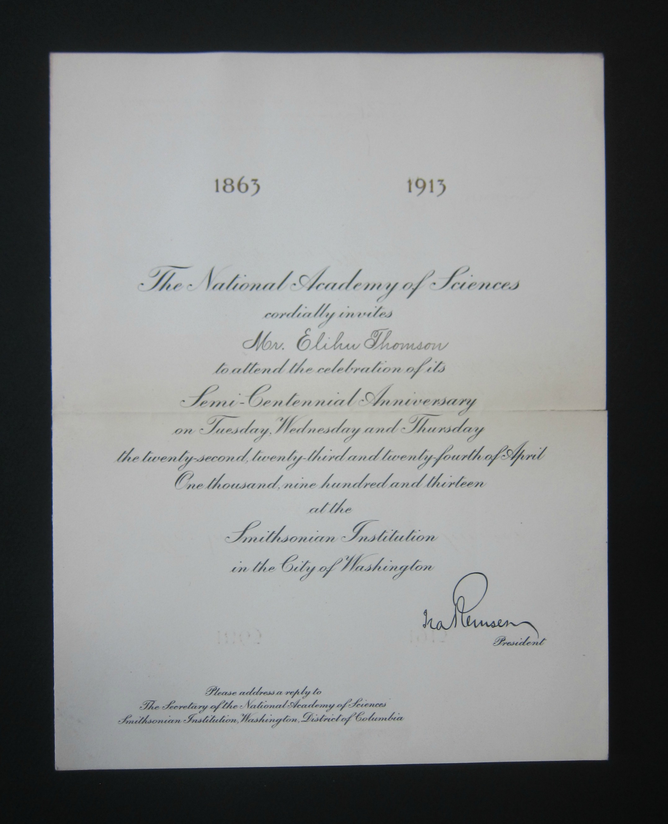 Elihu Thomson. Engraved invitation to attend the National Academy of Sciences semi-centennial anniversary at the Smithsonian Institution, April 1913, "signed" by the Academy president, Ira Remsen.