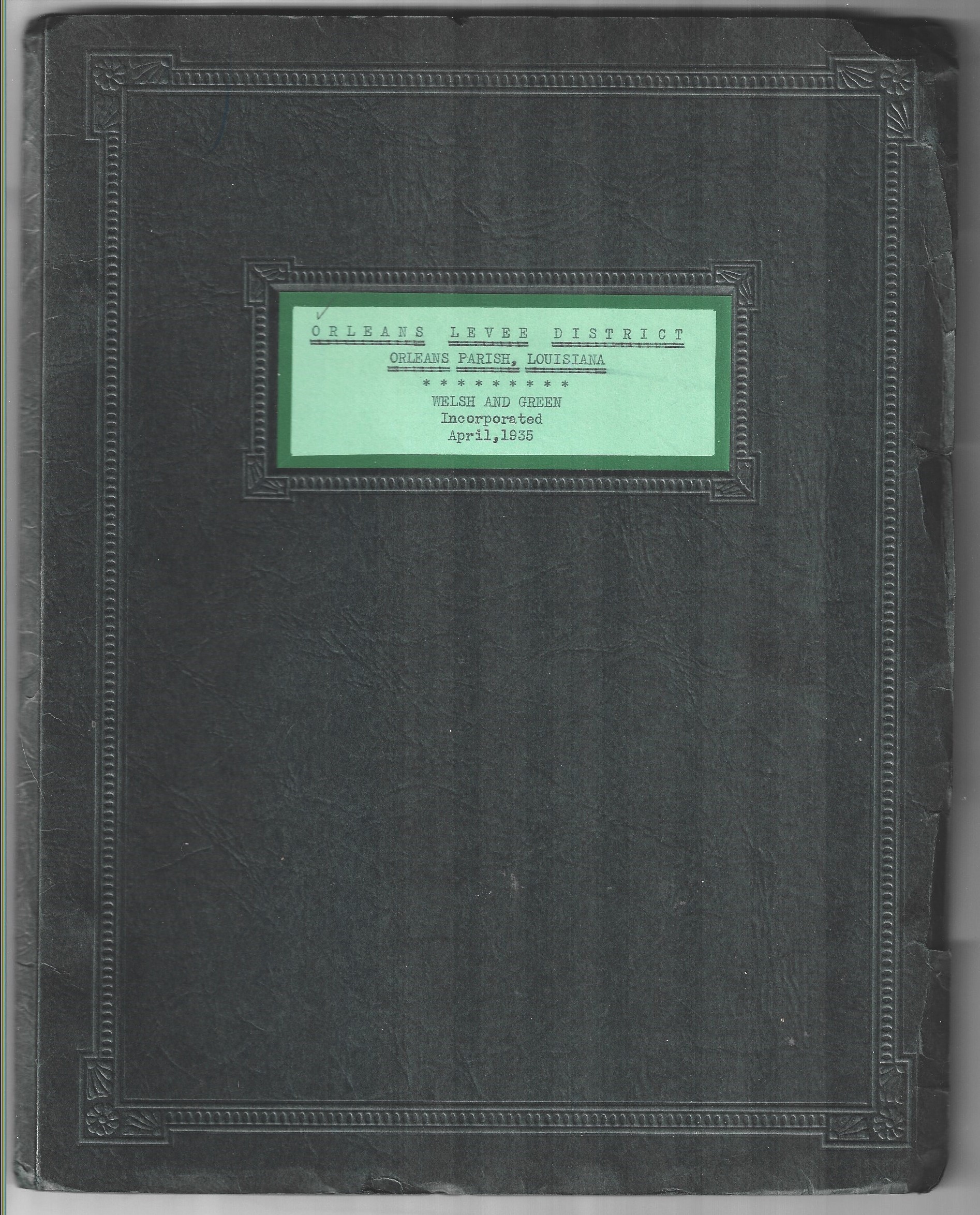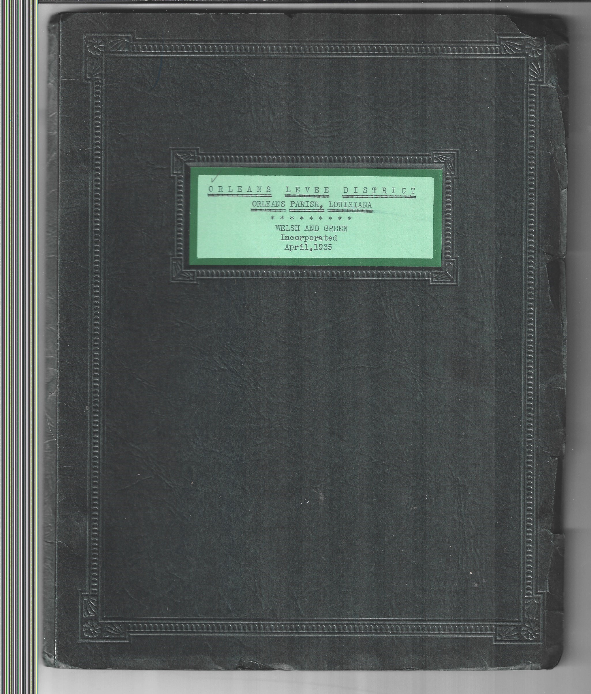 Welsh & Green, Inc (Chicago). Orleans Levee District, Orleans Parish, Louisiana. No publisher, no place of printing, April 1935. 11.5x8", 31 leaves, plus (20) leaves, including 5 folding plates of tables and one map. This is a offset type-printed document, presumably done so in very small numbers, for a presentation made by the firm of Welsh & Green before the Orleans Levee District Board, recommending ways of financing the various improvements to the levees and the airport.