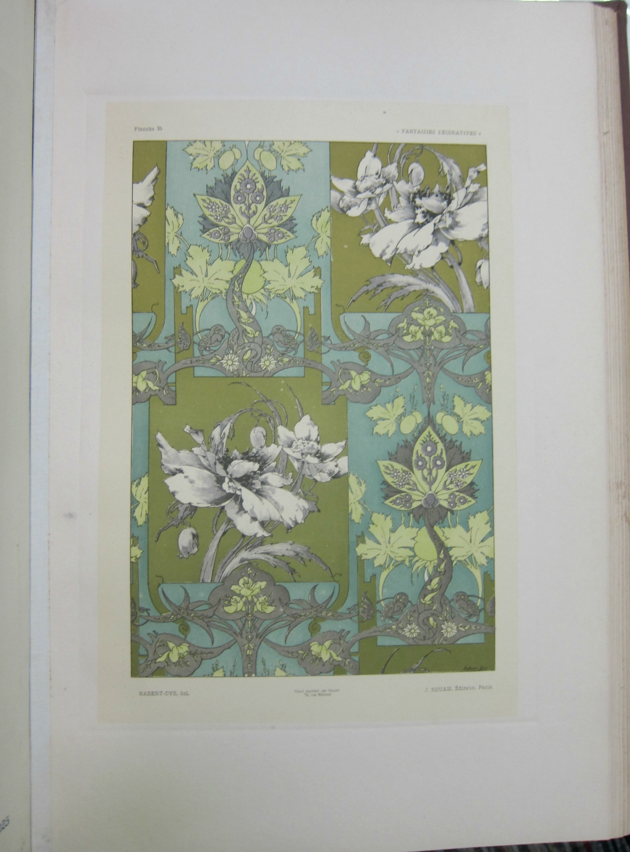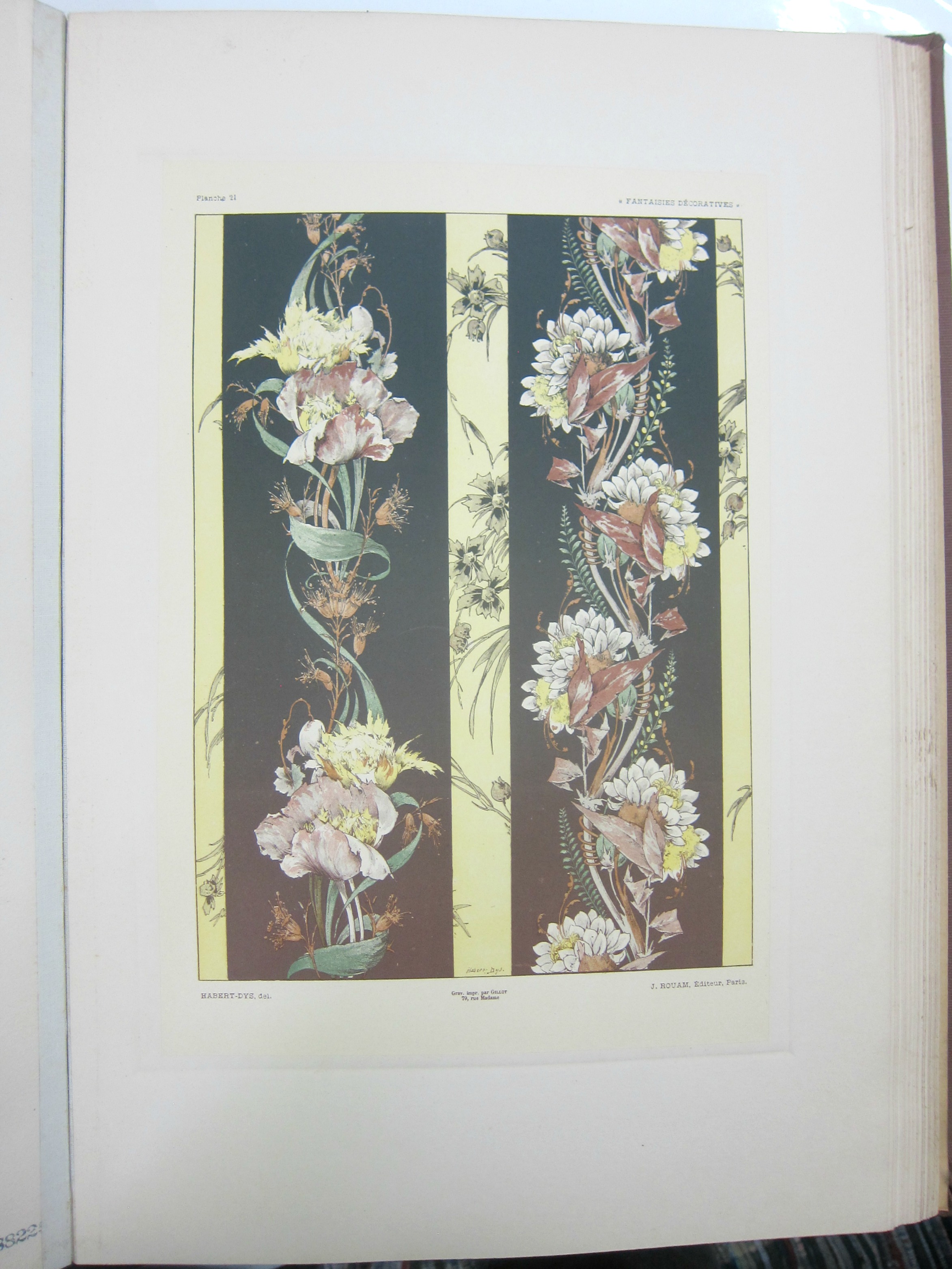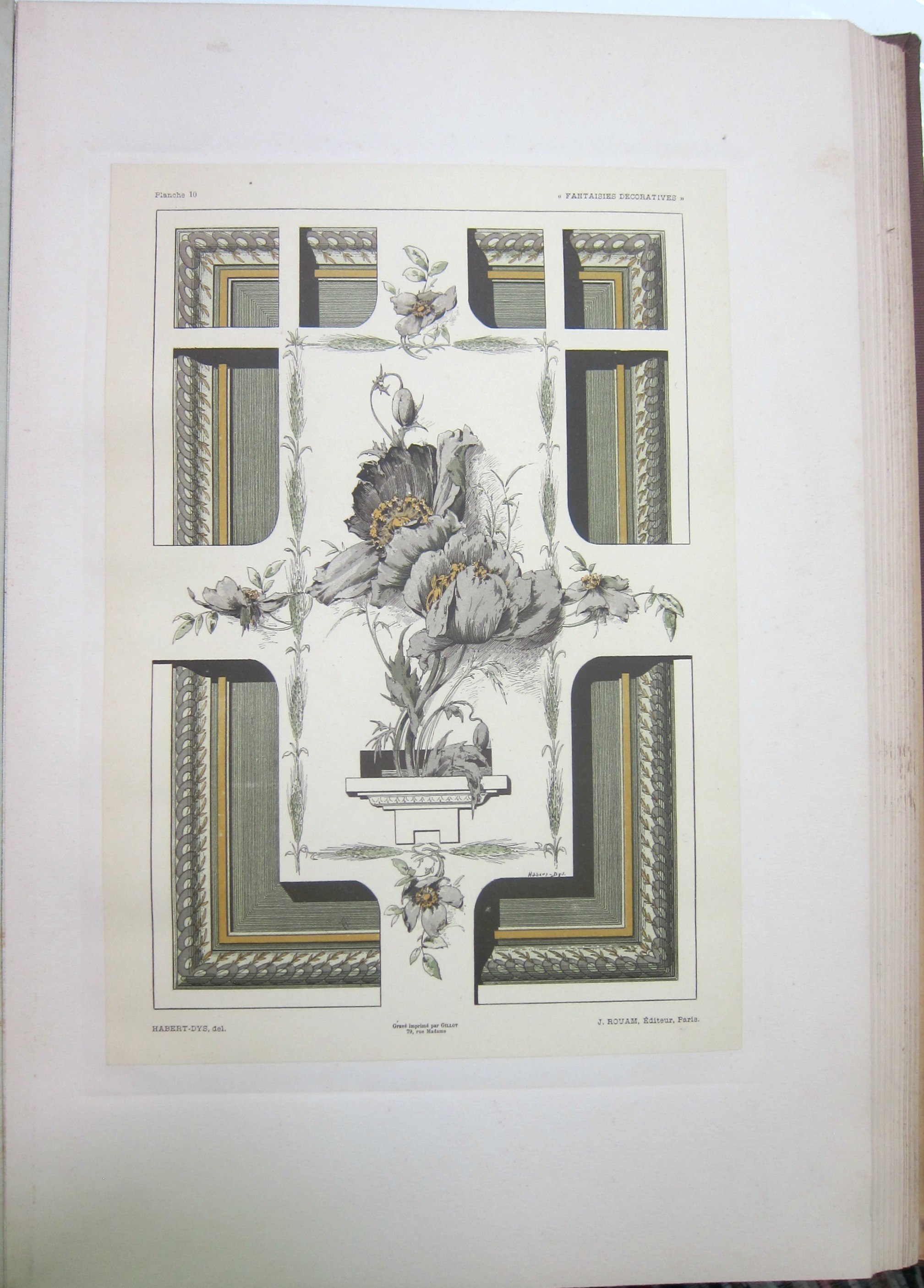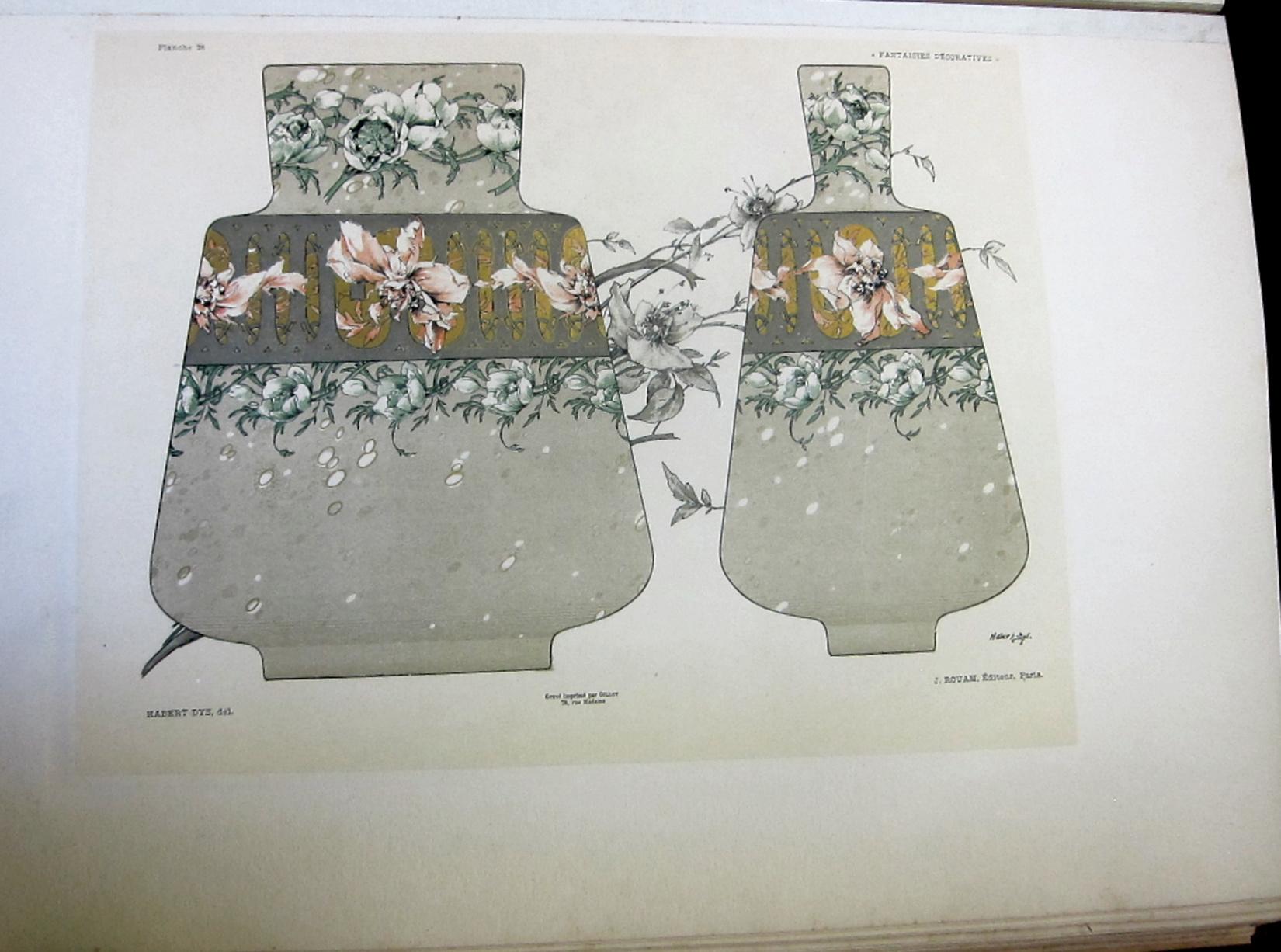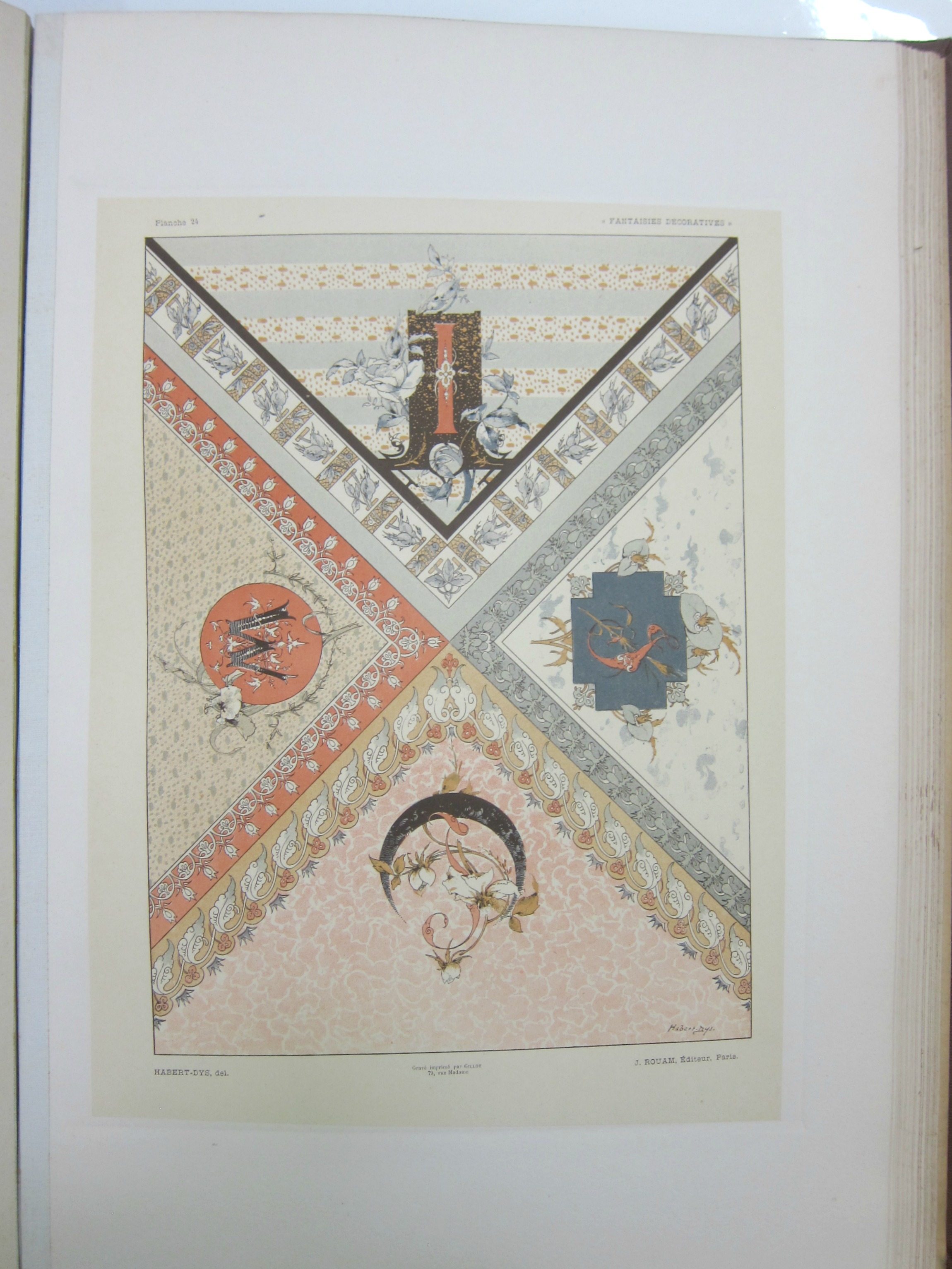 HABERT-DYS, J[ULES-AUGUSTE] - Fantaisies Decoratives. Documents pour servir a la decoration des Faiences, Meubles, Tissus, Bijoux, appartements, etc. .... Quarante-huit planches renfermant environ deux cents motifs. Paris, Librairie de l'Art, n.d. [1887-8] . 48 superb chromolithograph plates by Gillot, greatly influenced by the Japanese style and in a very accomplished art nouveau air, all heightened with gold, on cream paper, mounted on heavy white paper. Folio, (4) pages, title and list of plates.