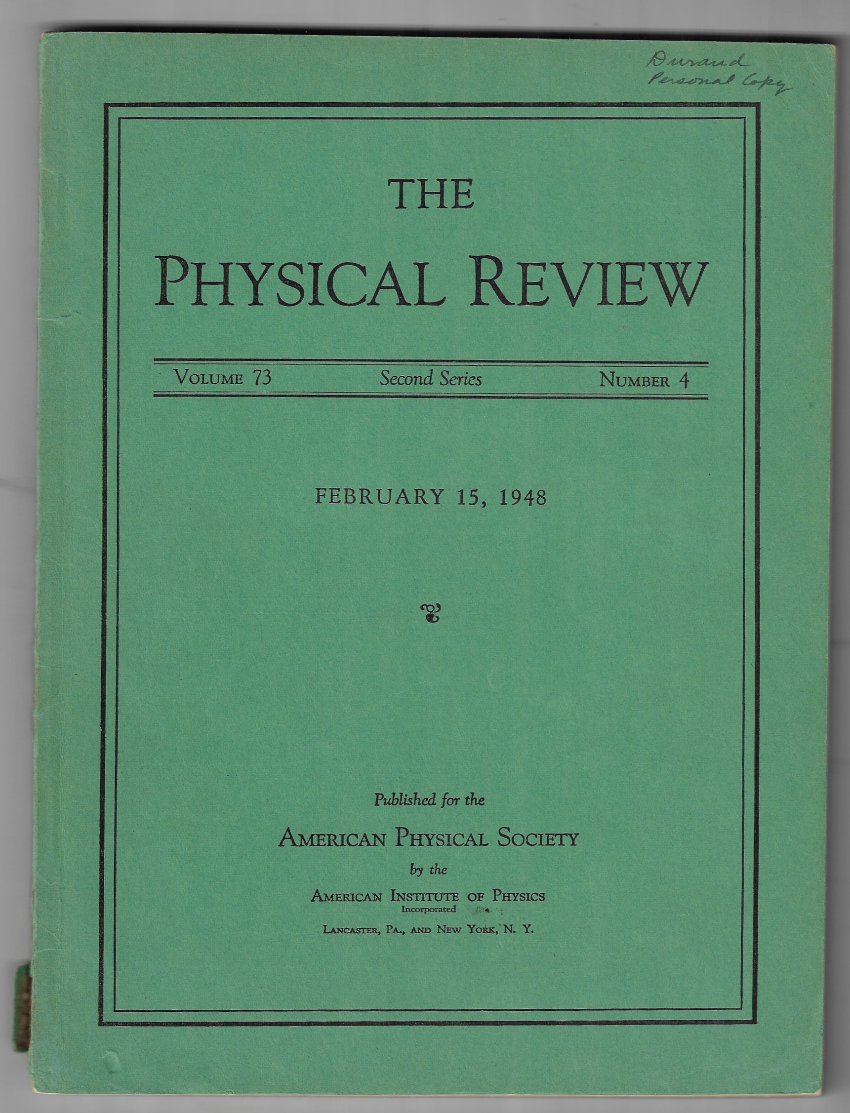 Hendrik Casimir and Dirk Polder, “The Influence of Retardation on the London-van der Waals Forces”, in Physical Review 73 No. 4 pp. 360–372, February 15, 1948. AND in the same issue: Julian Schwinger, “On Quantum-Electrodynamics and the Magnetic Moment of the Electron” pp. 416–417. Original wrappers. Owner's name (“Durand” on front cover, spine sunned; bottom piece of spine covering splitting; otherwise a fine copy. $175