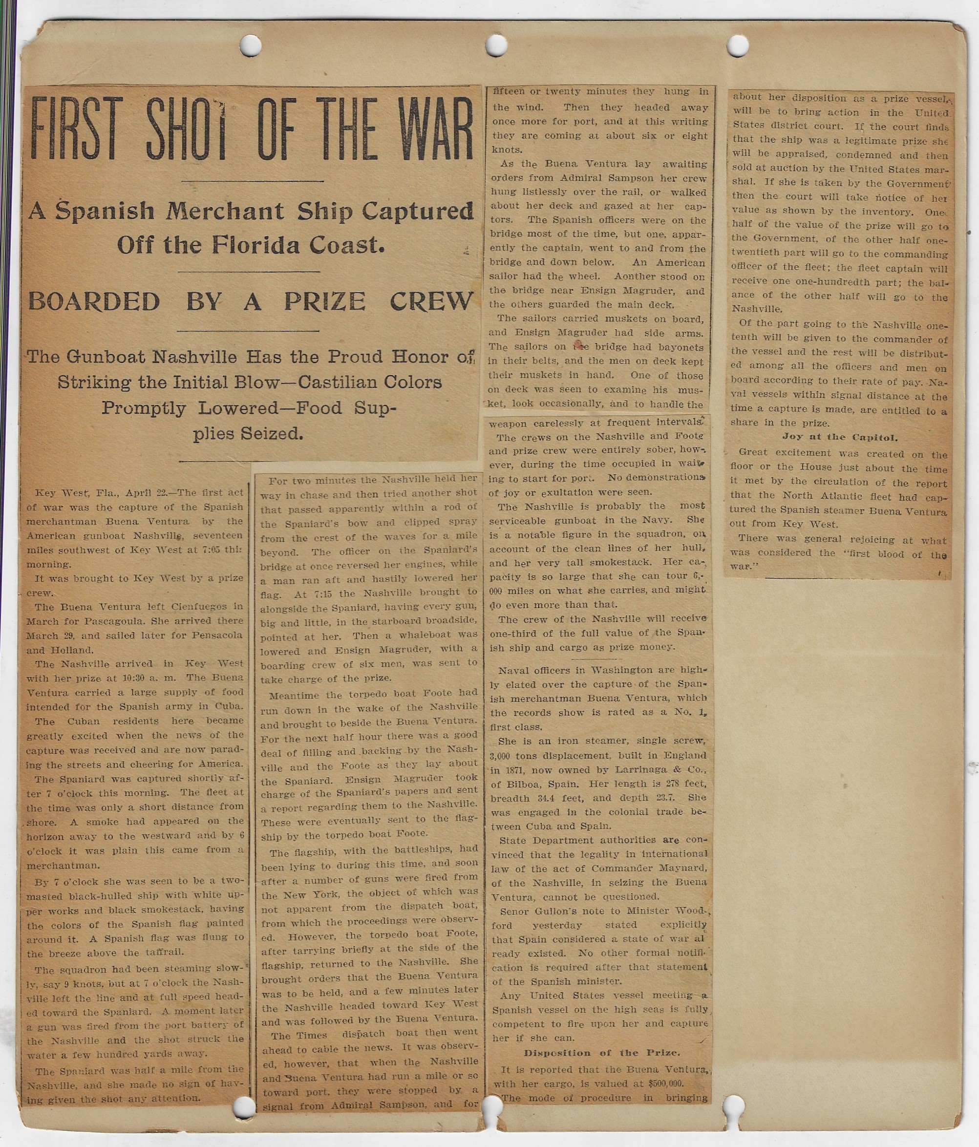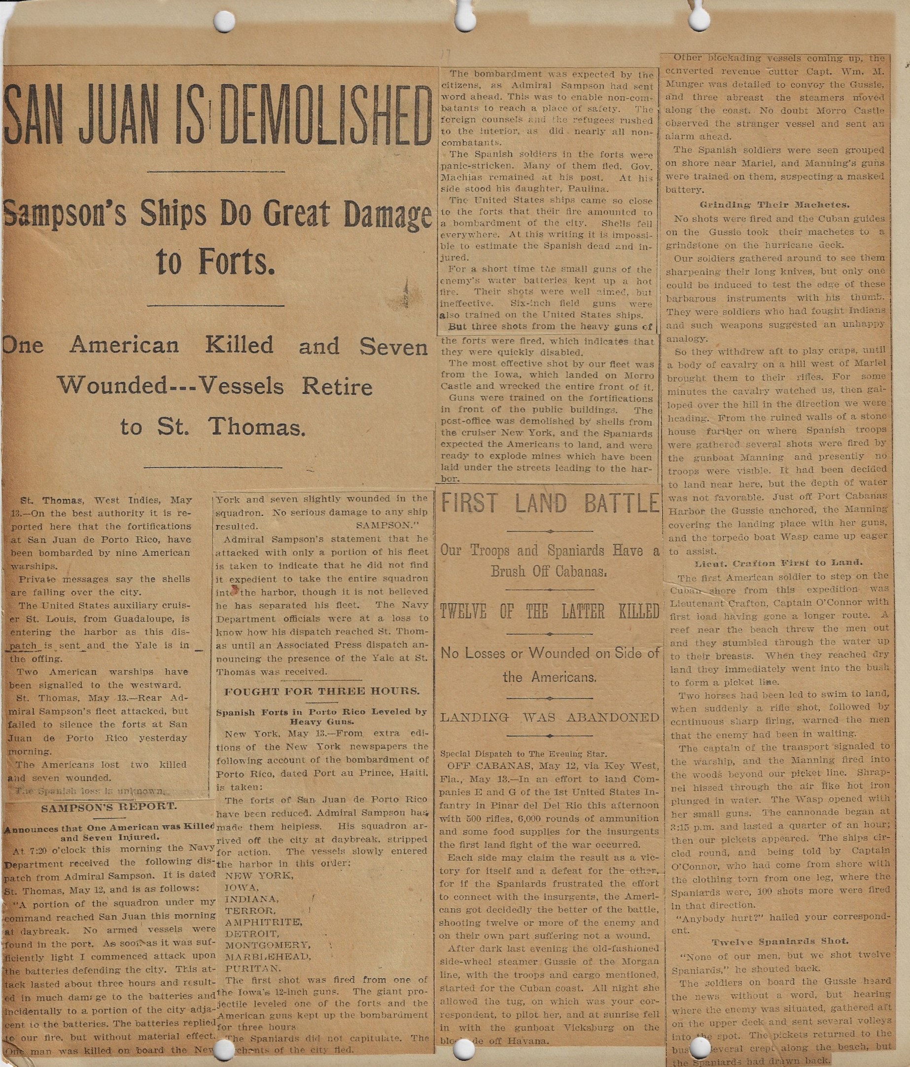 This scrapbook follows the course of the short-lived war in Cuba between Spain and the United States. (The war/insurrection in the Philippines that is another result of this war was an entirely different and much more complicated and bloody matter.) Most of the major aspects of the Cuba 1898 conflict are seen in these pages, along with a few references to Col. Theodore Roosevelt and the Rough Riders.
