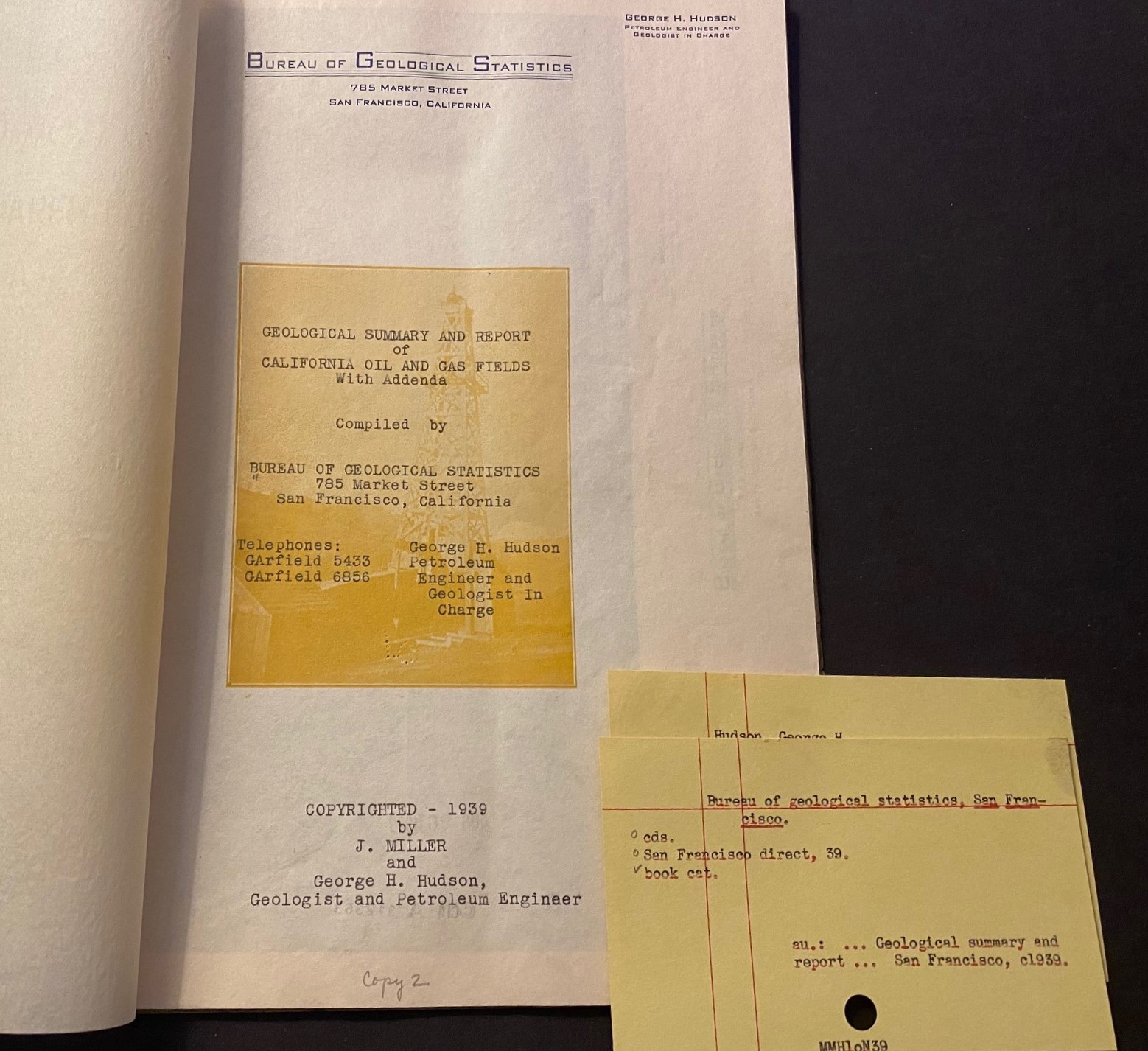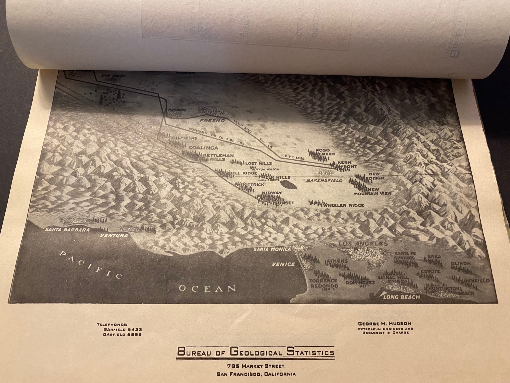 Compiled by Bureau of Geological Statistics (San Francisco). Copyrighted by J. Miller and George H. Hudson (Geologist and Petroleum Engineer). Carbon copy, with homemade paper wrappers. 11”x 8.5”, 2 (unusual) birds-eye views, ii, 27pp, 4pp appendix. Bound with brass brad fasteners. $1500.00