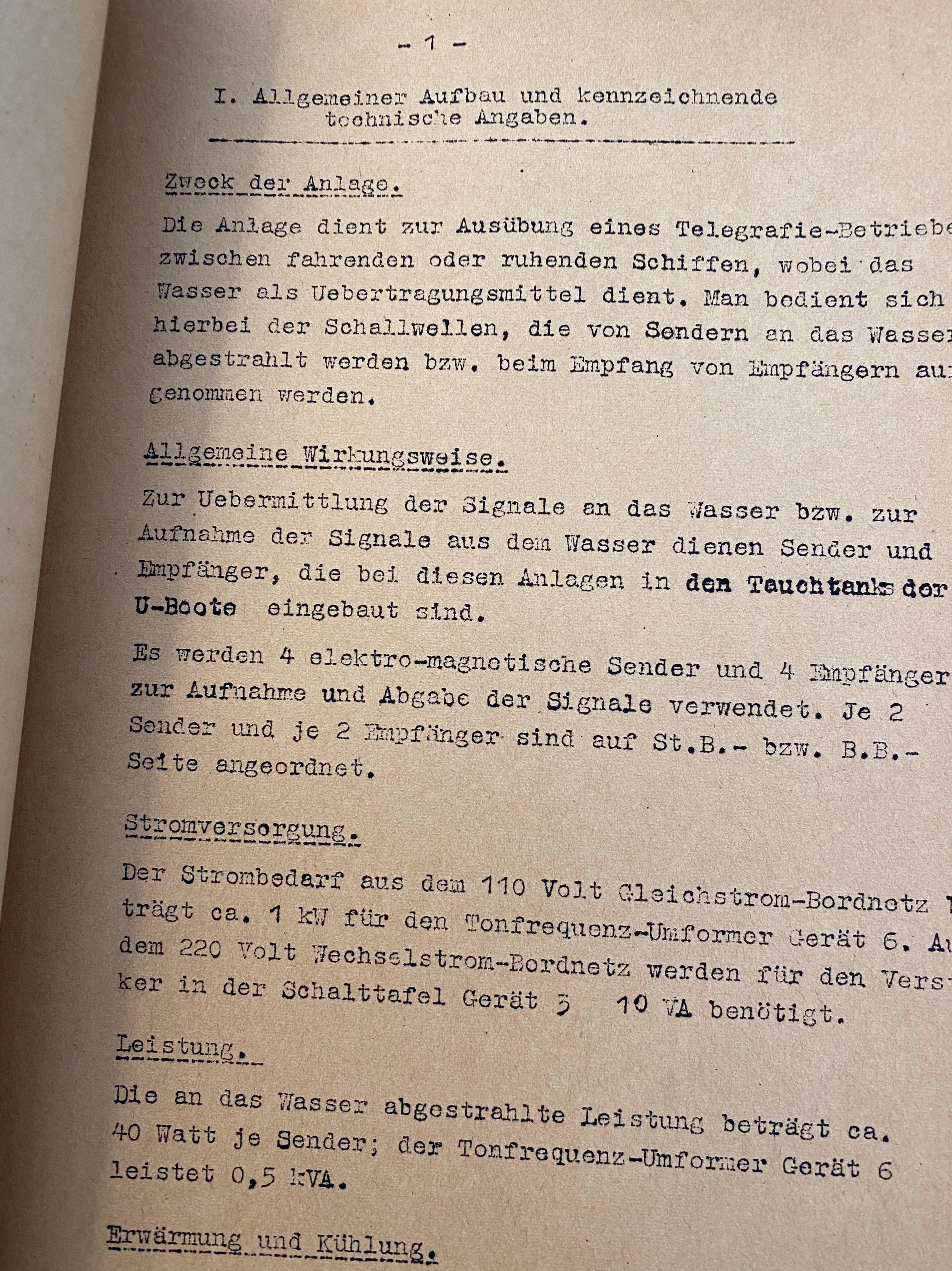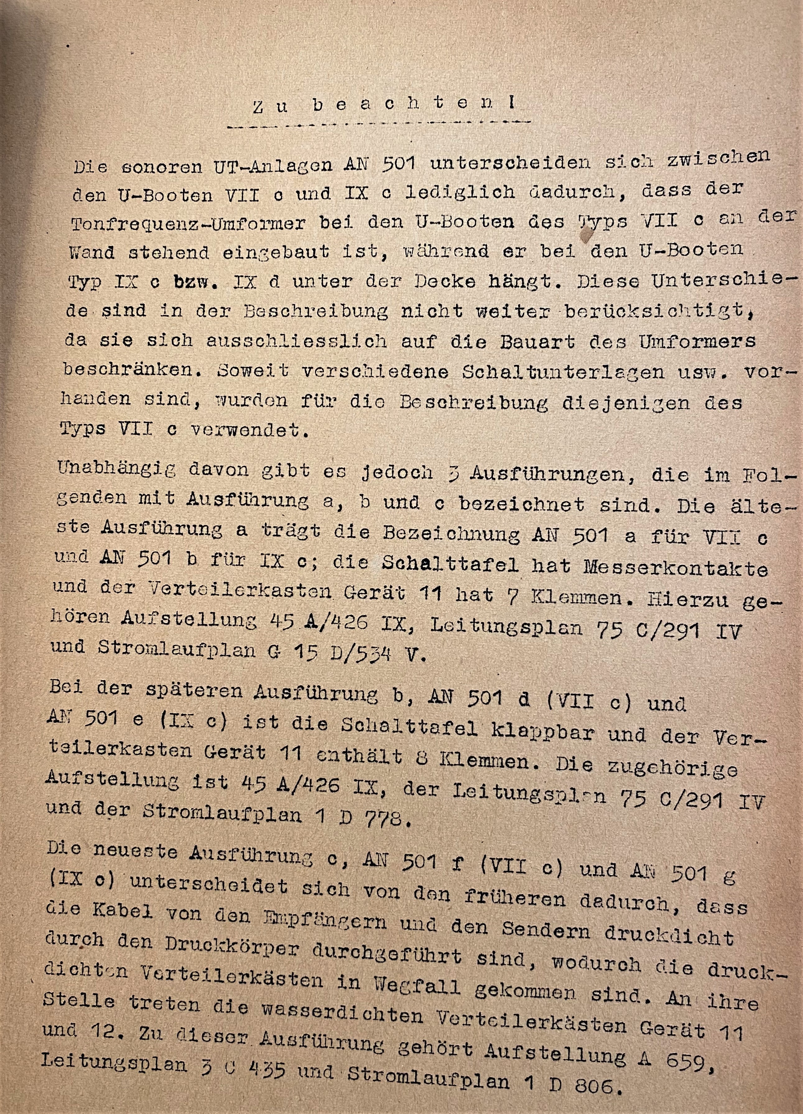 I take it that the SONAR system described in great detail here (for boats VII c, IX c, and IX d) may related to that equipment aboard the U-boote 501 (which was a IX c, departed Kiel, and which sank 10 Sept 1941), though it may reference a particular class of U-boote...I'm not sure. I thought the cover page for the work would clarify that but it doesn, at least to me—it does point out some minutiae, for example, that the AN 501 a is used for the VII c and the AN 501 b for the IX c. That sort.
