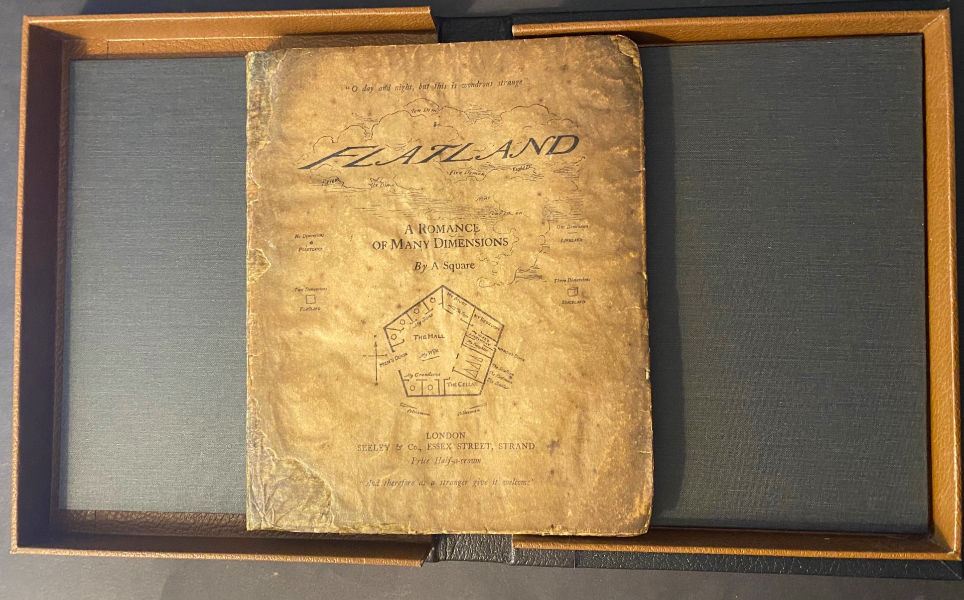 (ABBOTT, Edwin Abbott). Flatland, a Romance of Many Directions, by a Square. London, Seeley & Co., 1884. First edition. 8.5"x 7" (22x18cm), viii, 100pp, with very occasional diagrams in text. Bound in stiff vellum-like wrappers. The wrappers are browned and have had some chips expertly repaired; the joints have also been strengthened an expertly repaired. The book is housed in a lovely (and new) leather solander case. The book is in VERY GOOD condition; the solander case is new. $1750