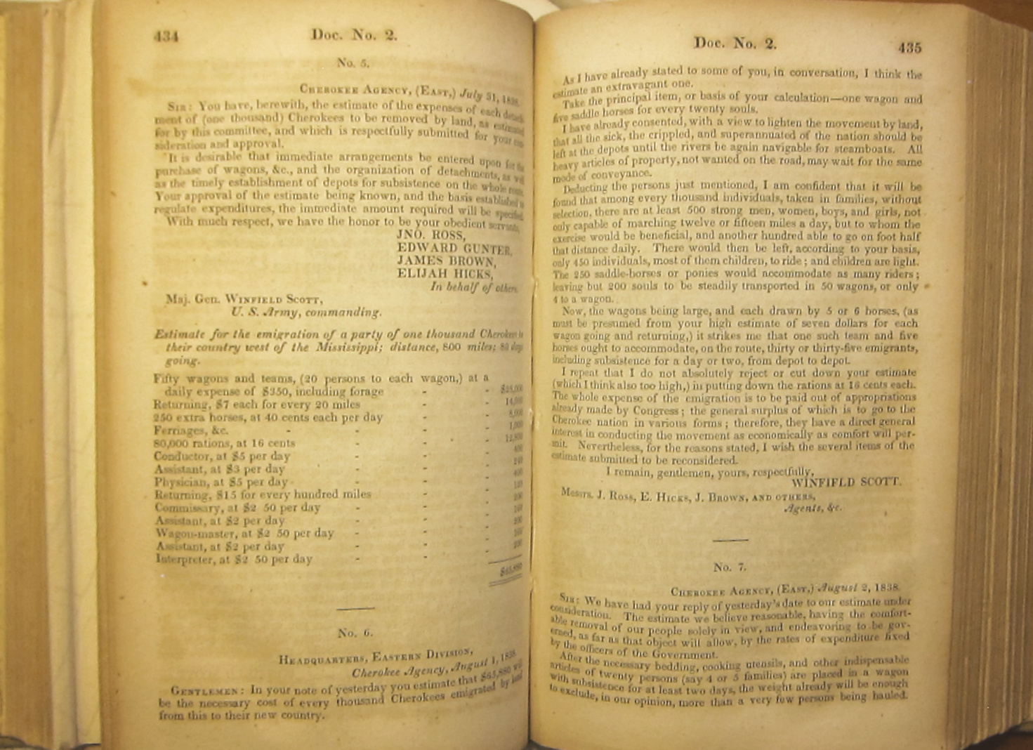 The section on the emigration of the Indians is alternately heart-breaking and infuriating. There is a series of correspondence between John Ross, representing the leadership of the Cherokees, and General Winfield Scott, regarding the mechanics and monetization of removal. The Cherokees at this point make every attempt to accommodate their pending future with dignity and humility, acquiescing on almost all government points in what I think were the hopes of gaining a few extra necessities for the people making the trip. Generally, the requests were rejected. Coffee and sugar were at one point presented to Scott as a necessary—Scott refused, saying that the disbursements for the removal had already been made, even though all of the monies were coming from government funds allocated to the Cherokees for the lands they were having stolen on the heals of their exit.