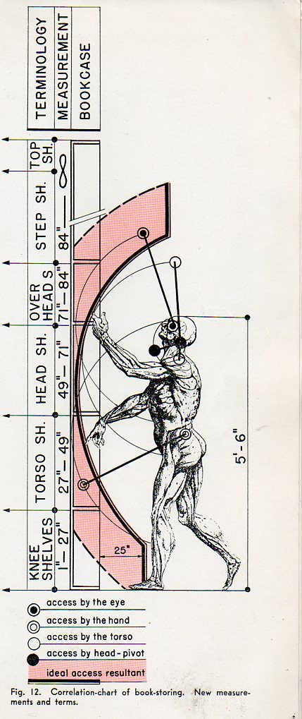 It is also interesting to see Kiesler's forensic analysis of the range of human motion regarding the selection of books from shelves (and using a Vesalius image for his 5'6" person):