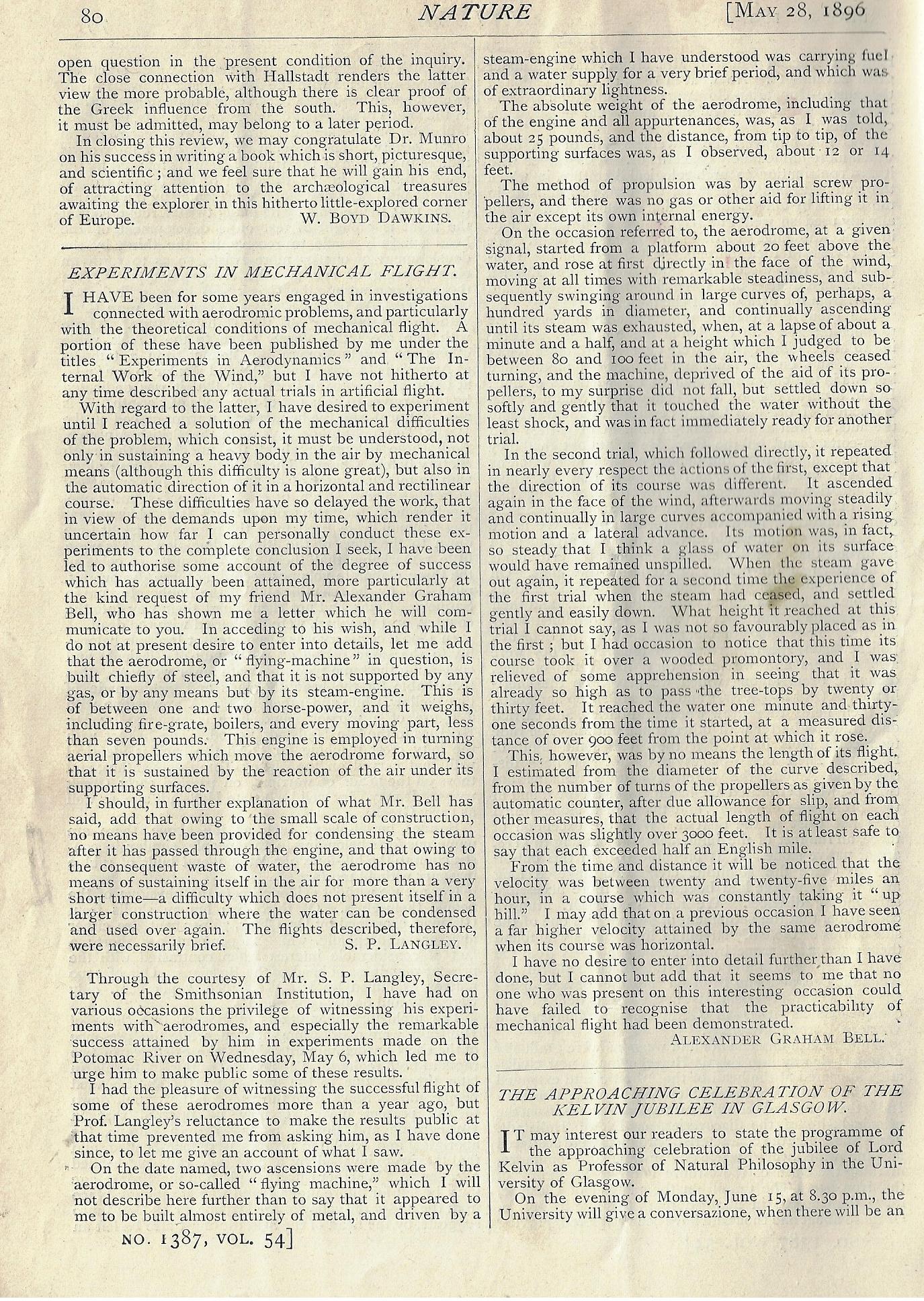 - The first report on the flight seems to have been in Science, May 22, 1896, according to Brockett's Bibliography of Aeronautics, #7160.