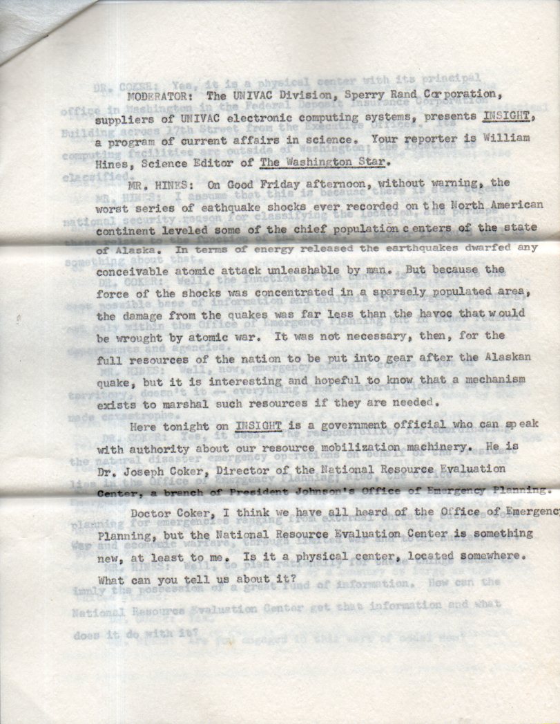 UNIVAC, Division of Sperry Rand Corporation, presents INSIGHT. Carbon copy transcript of a broadcast on Radio Station WGMS, Washington D.C., April 13, 1964. 8 leaves on onionskin paper. Fine copy. Two horizontal folds. SOLD
