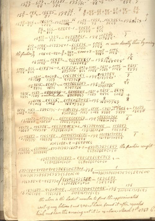 The only note that Mr. Fisher makes on his calculations is for the sqrt(193), which he notes as “the hardest number to find the approximate root of any between 1 and 200. I have found it after repeated trials and have this evening wrote it in as above. March 1st, 1833. CF.” (This may actually be 1838--I think it is dependent on interpretation.)
