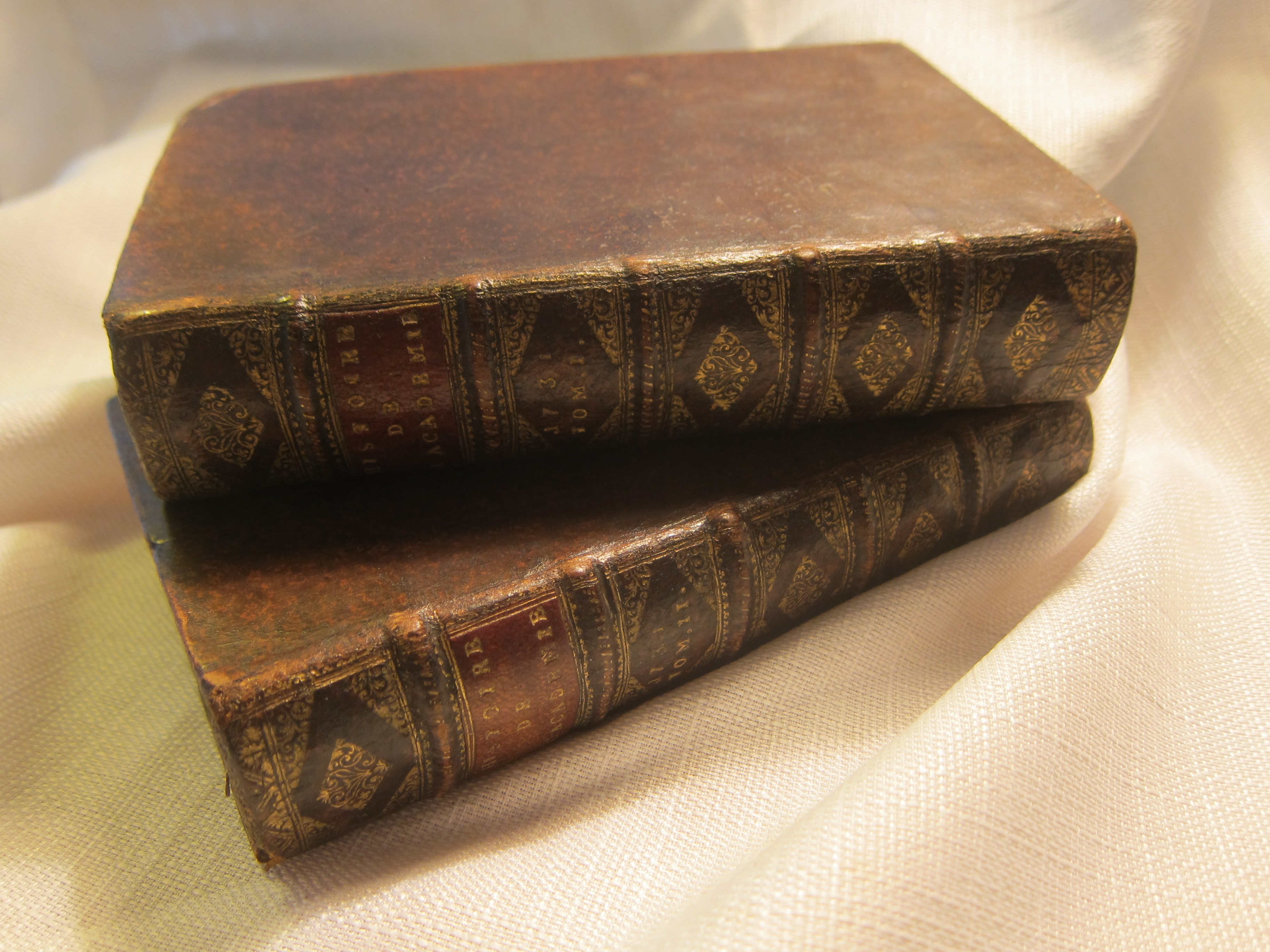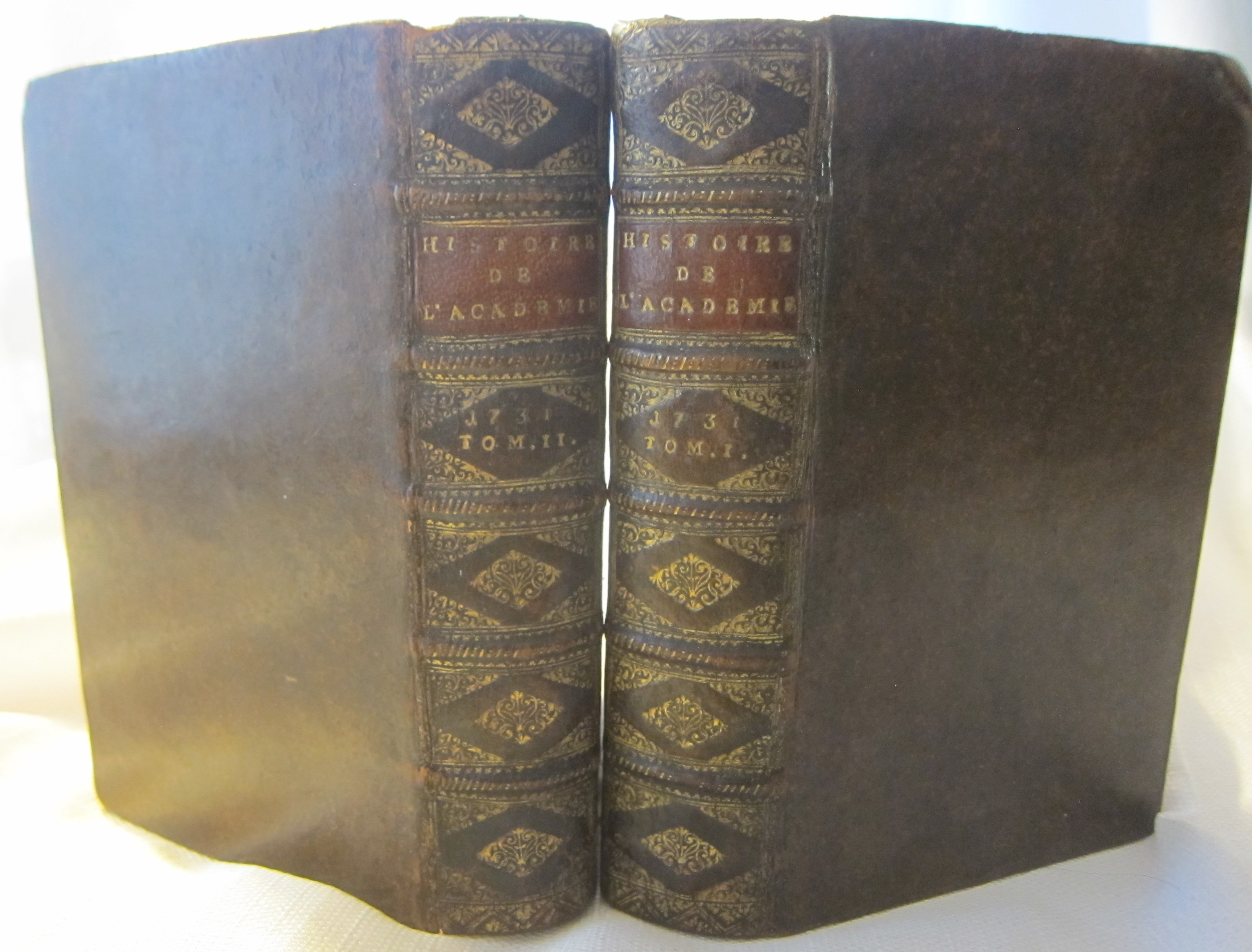 Clairaut, Alex Claude (b 1713, making him 18 at the time of the reception of the paper in 1731), "Sur les Courbes que l'ou forme en coupant une surface courbe quelconque, par un plan donne de position", pp 680-694. ("...on solid analytic geometry, a pioneering study of the differential geometry of space curves"--Parkinson, Breakthroughs, p. 149). Bound in: Histoire de l' Academie Royale des Sciences. Annee M. DCCXXXI. Avec le memoires de mathematique & de physique, pour la meme annee. Amsterdam by Pierre Mortier, 1735, 17x10cm., viii, 155pp; plus the Memoires section, pp 1-316 in this volume, and pp 317-737, with 40 folding plates. Bound in full leather, with raised bands. Lovely copies, very fresh and clean. Two volumes; Very Good condition. $450