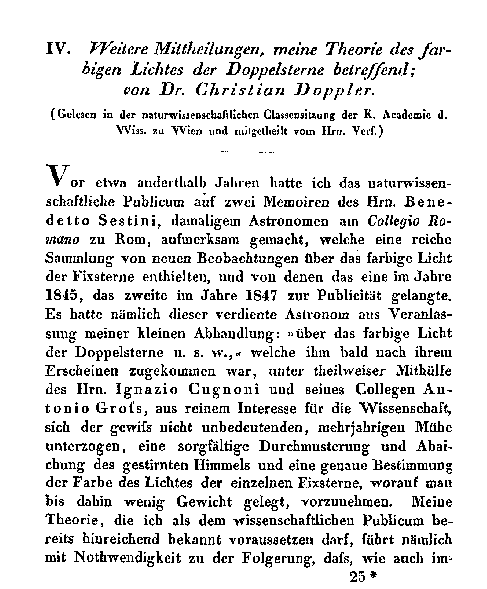 1) Christian Doppler. "Weitere Mittheilungen, meine Theorie des farbigen Lichtes der Doppelsterne betreffend" in Annalen der Physik und Chemie; Leipzig, Johann Ambrosius Barth, 1852, volume 85 (161), where the Doppler paper occupies pp. 371-378. This appeared slightly earlier in the year inSitzungsberichte der Kaiserlichen Akademie der Wissenschaft, volume 8 (Kaiserl. Akademie der Wissenschaften in Wien. Mathematisch-Naturwissenschaftliche Klasse), 1852. I reproduce Doppler's bibliography in the Kaiserl. document at teh end of this post--it may be interesting and useful.)