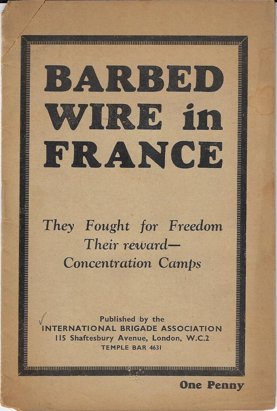 Barbed Wire in France, They Fought for Freedom, their Reward--Concentration Camps. Published by the International Brigade Association in London, ca. 1940. Good copy, though the text is browned and the left upper corner is nearly detached (as you can see in the photo). Still, an uncommon work on an uncommon topic. PROVENANCE: Library of Congress, with their 6mm perforated stamp on the front cover, and their surplus stamp on the rear cover. $95