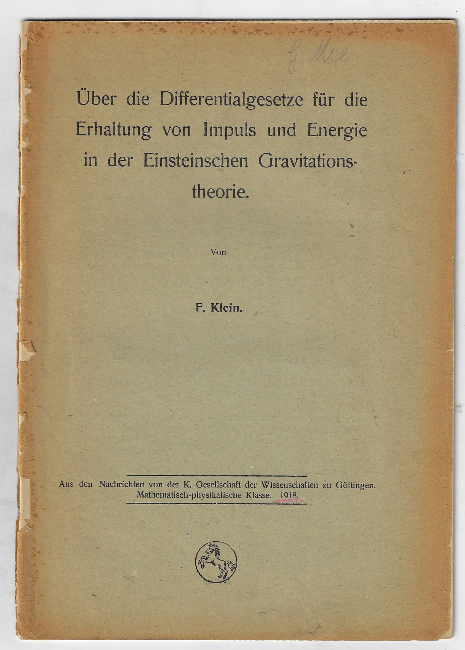 KLEIN, Felix. "Über die Differentialgesetze für die Erhaltung von Impuls und Energie in der Einsteinschen Gravitationstheorie", (“ the differential laws for the conservation of momentum and energy in the Einstein theory of gravitation.”) published by Nachrichten von der Königliche Gesellschaft der Wissenschaften zu Göttingen Mathematisch-Physikalische Klasse, 1918). 19pp. $500