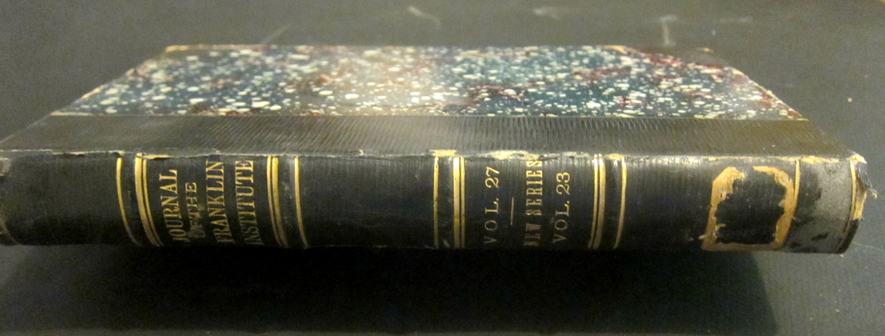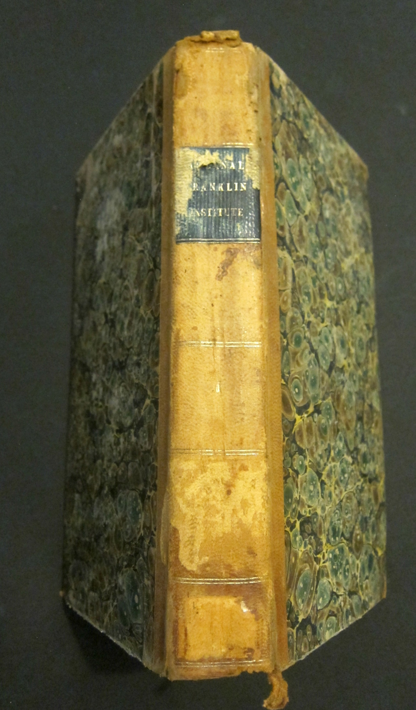 All in the September, 1839 issue of Journal of the Franklin Institute, printed in Philadelphia by the Institute, 1839. The entire volume offered, volume 28 (new series vol 24) , (442pp). Bound in half-calf and marbled boards. The spine is scuffed and chipped at head and toe, and the front board is detached. Also, this is an ex-library copy, with stamps on the title page. All that said, the text is fresh and crisp. A GOOD copy, only. $600