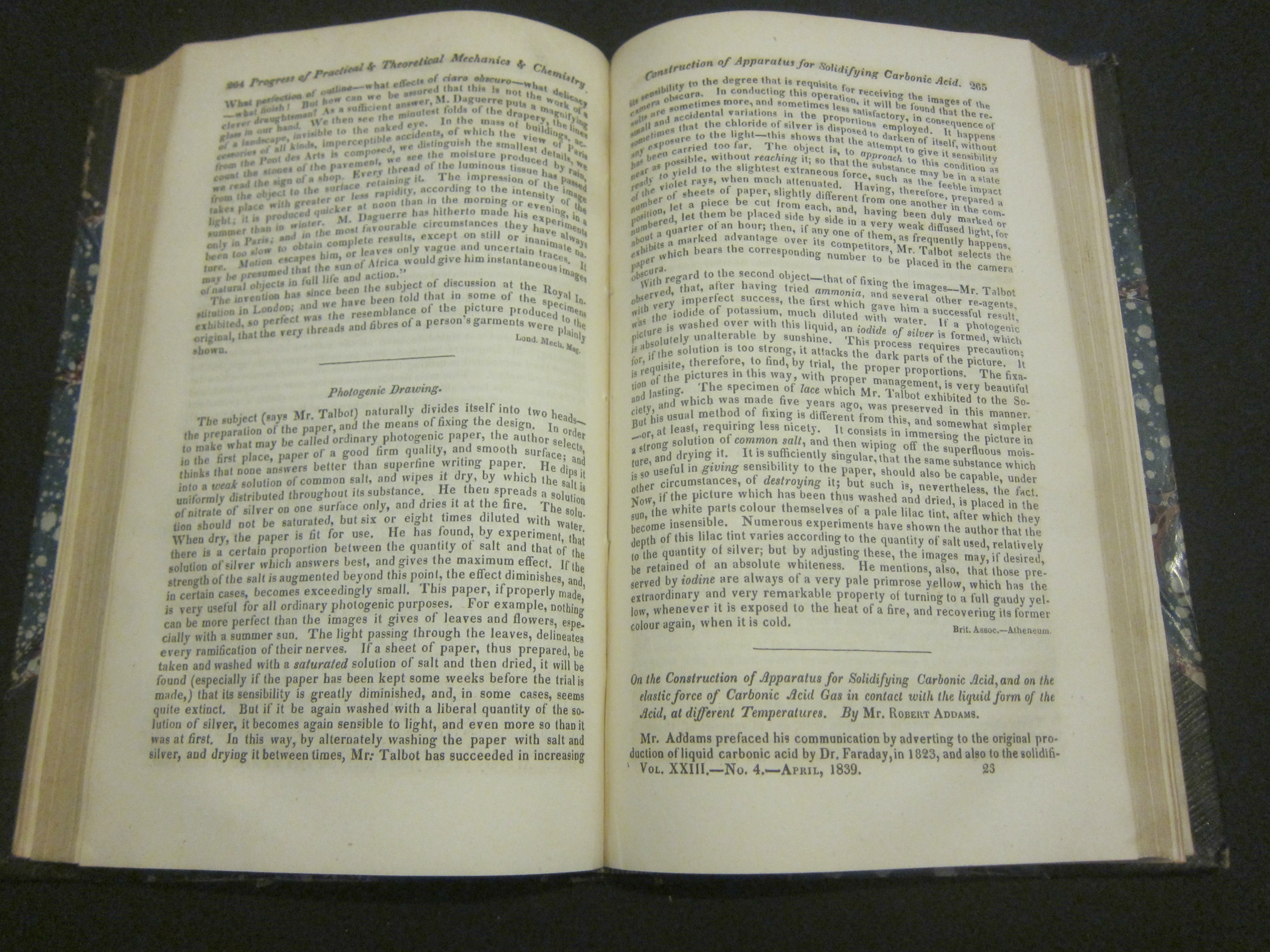(Daguerre and Fox Talbot) “Photogenic Drawing” followed by “Photogenic Drawings” in The Journal of the Franklin Institute, Vol. XXIII, April, 1839, No.4, pp. 263-265 (about 1500 words). Bound in half-calf and marbled boards.There are two shadows left on the spine bottom from call numbers; there are also some library marks and a stamp on the front cover, otherwise this is a very nice copy. $750