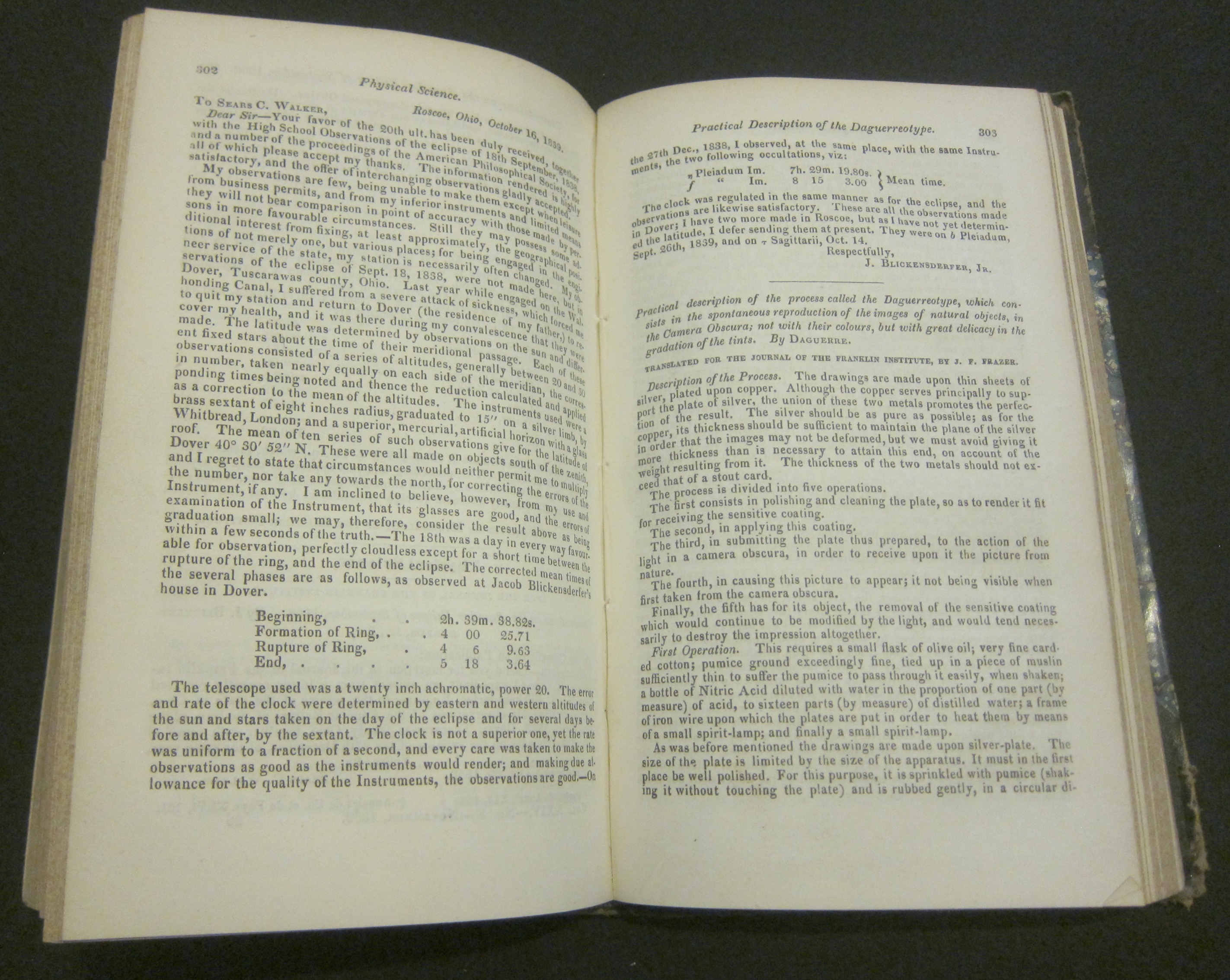 (Early Photography) “The Daguerreotype”, long paragraph on p 142 on the “great obstacle to the use of M. Daguerre's photogenic process, is the great difficulty of preserving the pictures when completed...” in Journal of the Franklin Institute, Philadelphia, printed by the Institute, 1840. Offered in the volume of 430pp.