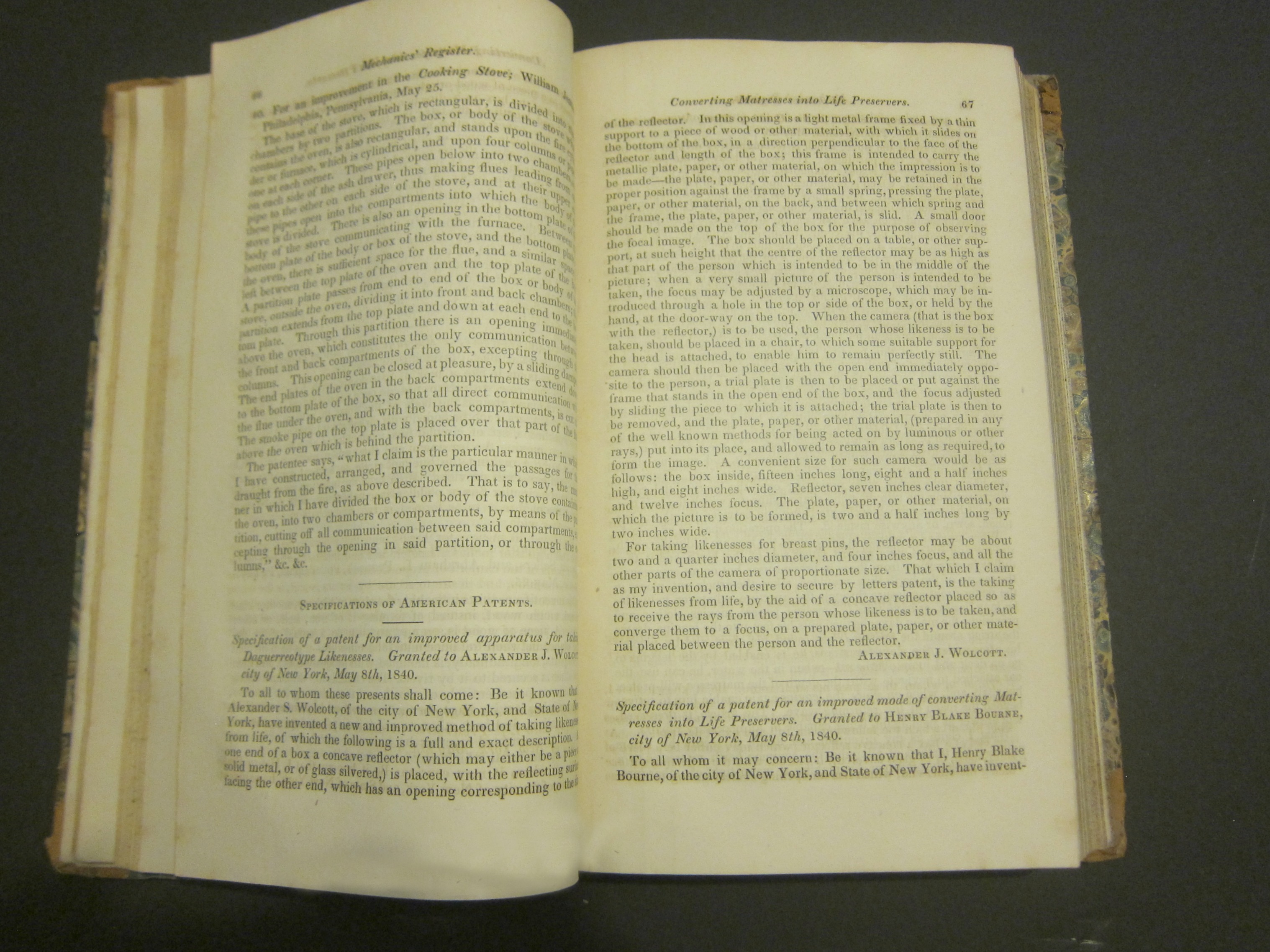 WOLCOTT, Alexander J. Specifications of a patent for an improved apparatus for taking Daguerreotype Likeness. Granted to Alexander J. Wolcott, city of New York, May 8, 1840. In: Journal of the Franklin Institute, edited by Thomas P. Jones. Philadelphia, printed by the Franklin Institute, 1841. Volume 32 (overall), Third Series,vol II. The article occupies pp 66-7 in the issue of 430pp. Bound in half calf and marbled boards. Ex-library copy, with ghost imprint of two small rectangles of Dewey call numbers on the spine, plus bookplate, and a blind stamp owner stamp on the title page. Spine is somewhat scuffed and rubbed, and and in general a bit tatty. Good condition, only. $600