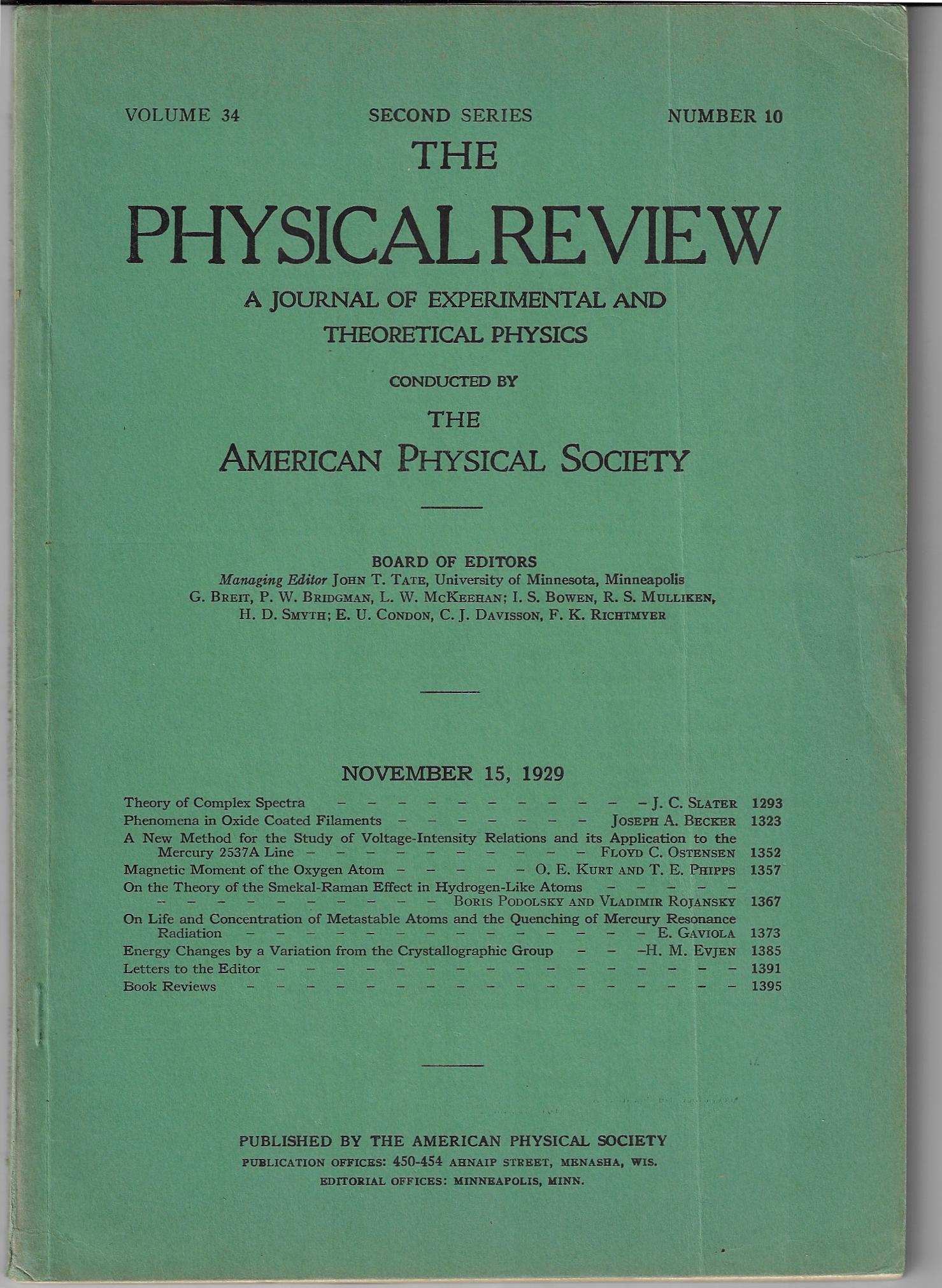 H.P. Robertson, "The Uncertainty Principle", in Physical Review, July 1, 1929, Volume 34 number 1, pp 163-4 in the issue of pp 1-166 (plus ads). Original wrappers. Three-ring-punch holes in the left side of the publication from where the issues for the half-year were gathered up and bound. Other than this (big) thing, a nice copy., and reflected in the much-reduced price. $150