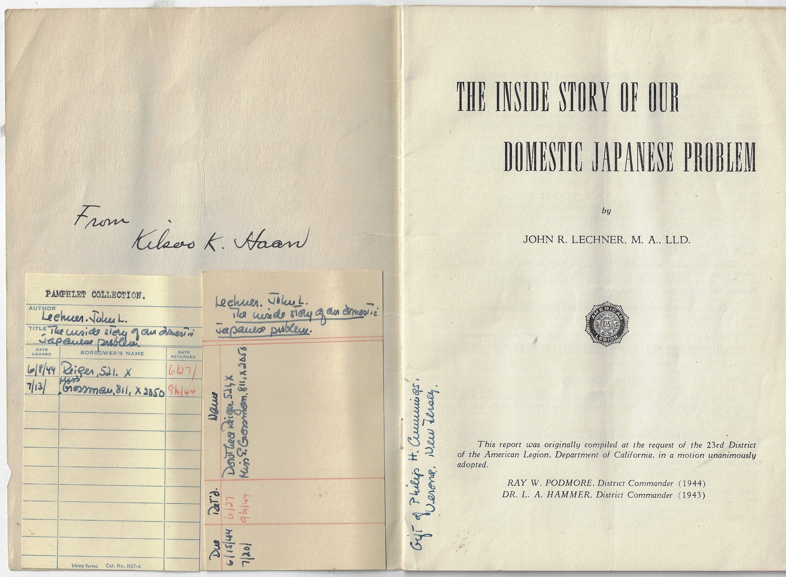 Lechner1, John R. The Inside Story of our Domestic Japanese Problem. (1944) American Legion of California. 10”x 7”, 18pp. Provenance: Kilsoo K. Haan2, to Phillip H. Cummings, who gave this to the Library of the Office of Strategic Services (OSS, precursor of the CIA), and from there to the Library of Congress. Rubber stamps for the OSS library and for the Library of Congress.