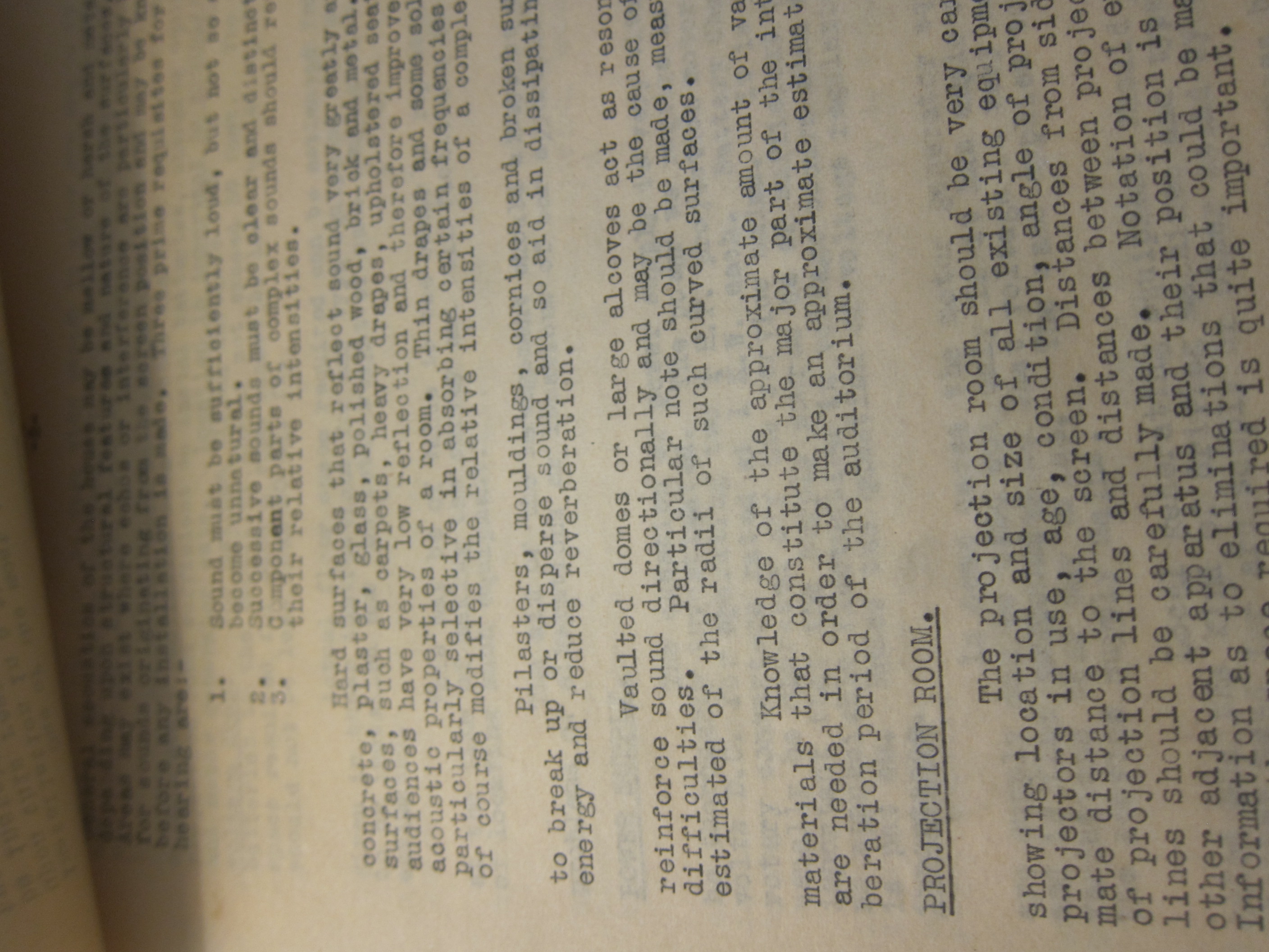 Content: following a general intro to the equipment, which is followed by four section, including the auditorium, the projection room, the power supply, and the power equipment. The auditorium notes interestingly describe what the operator of the photophone should pay attention to in the building, touching on the location of the speaker, but particular attention was made for the architectural properties of the auditorium and how they might affect sound quality. This is followed by the projection room comments, and then the power supply needs and the power equipment itself, the ending item being the “synchronous disk requirements”.