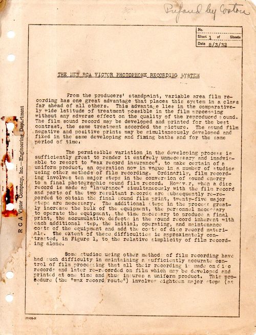 Provenance: Harold E. Sunde, with his initials in pen at top left front cover, and signed by him on final page. Sunde (1910-1990) was responsible for the explanation and demonstration of the RCA "Photophone" invention--one of the earliest simultaneous sound-on-film recorders and projectors, and introduced the machine to England and Russia, where true sound-on-film motion pictures were seen for the first time. He was also JHU APL, Sandia, Radiological Defense at Bureau of Ships, USAF). This document appears just a month or so before the showing of the first successful synchronized sound-on-film picture in England, A. Hitchcock's “Blackmail”. This a sound-on-film incunable. This means the pamphlet was printed within the first few years of the first "talking" (synchronized sound, or sound technologically coupled to image) motion picture. The first feature length film using sound throughout the length of the movie was The Jazz Singer, which was released in 1927 and used a sound-on-disc2 system of recording. That means that the audio portion of the film was recorded onto records, and then synchronized in playback with the film to match up the audio and video--this technology was obviously not the future.