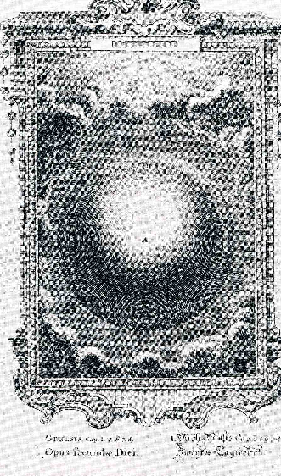 Jean-Jacques Scheuchzer created this cold, lonely, empty picture of the creator's handiwork on the second day of "creation". It is found in his Kupfer-Bibel, in welcher die Physica sacra, oder geheiligte Natur-Wissenschafft derer in heil. Schrifft vorkommenden naturlichen sachen, deutlich erklart und bewahrt, printed in Augsburg and Ulm by C.U. Wagner, 1731-1735. Offered in four volumes, illustrated with 758 plates, it is a magnificent work, if not altogether correct, or even near- correct, with an enormously confused pedigree, implying the wisdom and text of the Bible (and the old Testament at that) as the background for a physical history of the world. BE that as it may, Scheuchzer was an able scientist, professor of mathematics and physics, director of libraries, and somewhere in there he became one of the founders of paleontology. This work is a little hard for me to understand as piece of the history of science; its hard to get around the incredible ideas ensconced in deeply Baroque borders. This sort of encyclopedic approach to knowledge—especially without the Bible part—would have to wait another 45 years ro so for the great work of Diderot. For now, we are left here in 1735 with this picture of the empty Earth, waiting for the rest of it.