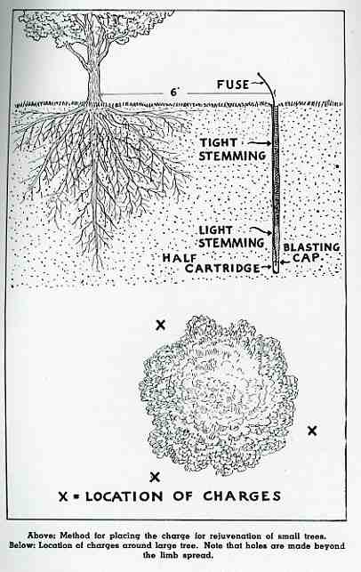 Hercules Dynamite on the Farm (published by the Hercules Powder Company in 1943)--isn't that a title that just begs to be read? "Ditch Blasting, Stump Blasting, Boulder Blasting, Soil Blasting, Gully Blasting, Tree Planting, Tree Rejuvenation"--keyword: blasting. Actually, the tree planting and rejuvenation parts also involved blasting: blasting was done to create the holes for planting tree; blasting was also done deep near the deepest roots of a stumpy tree to help create space for root growth. I have no idea if this was actually a good idea or not, but on the face of it, the blasting part seems to make sense.