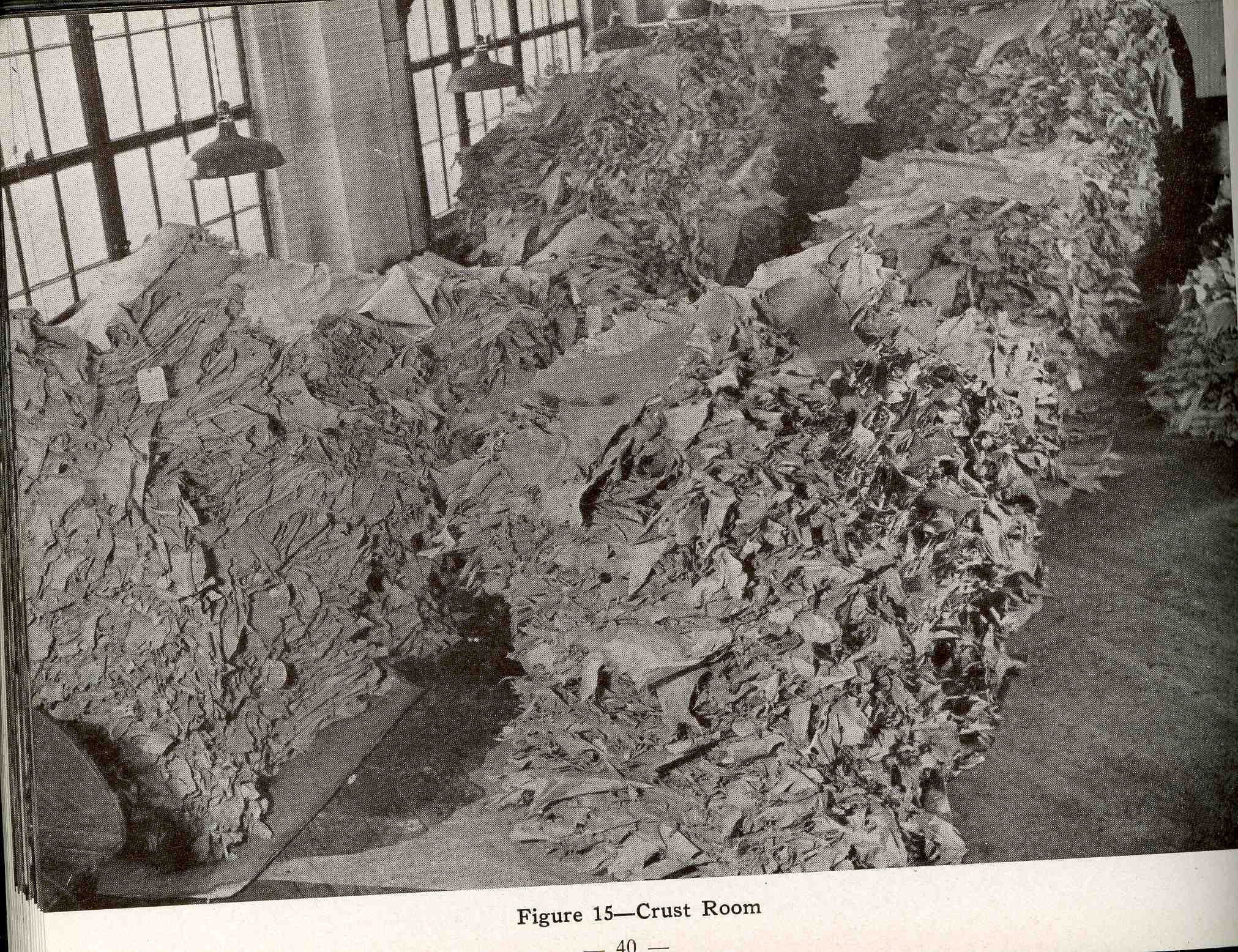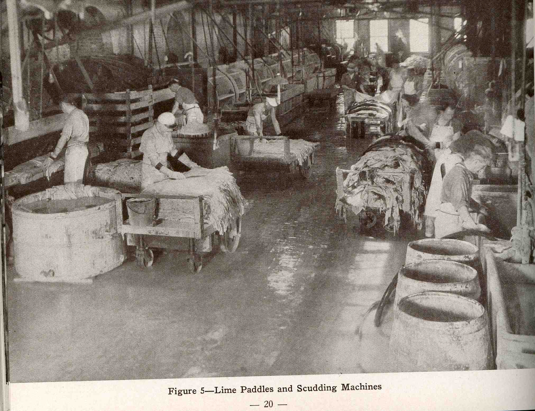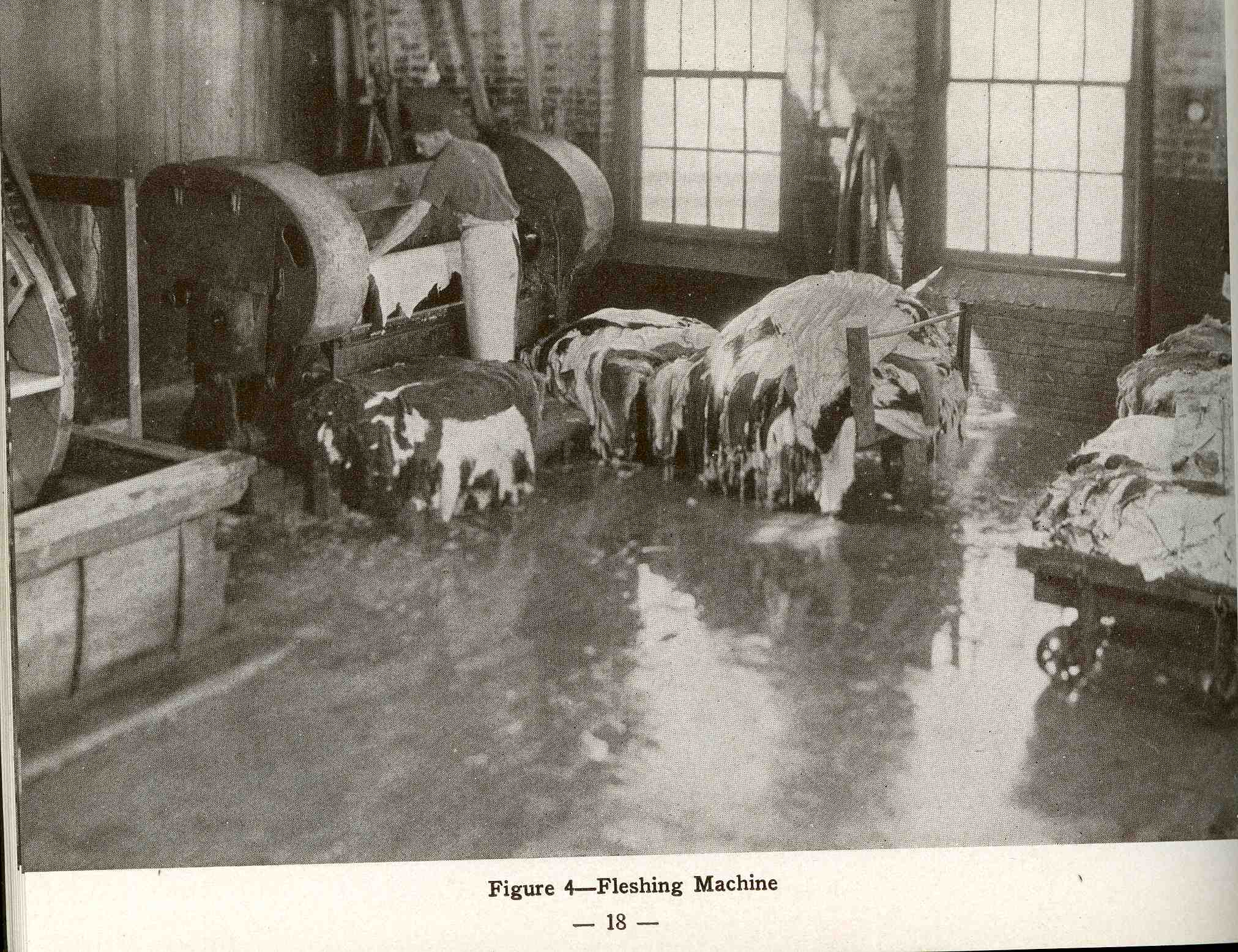 The Crust Room (!), Fat Liquor, assistant tackers, hair men, stackers, seasons, trip drivers, rolling jacks, nappers, grain buffers--all relate to something having to do with pulling, treating, stretching, and such to hides, or skin. As a matter this happened to a (claimed) 879,000,000 pounds of hide in the U.S. (That's almost a billion pounds of skin, which means, I suppose, that it must be coming from at least 80,000,000 cows and sheep. A year.) Soaking tubs, unhairing machines (?!), scudding machines and lime paddles, chrome rooms, tanning drums, pickle paddles, fleshing machines; all telling an unpretty story. The pictures tell the rest of the story--most of the men look hot, wet, a little dirty and befouled, with many of them working in puddles; I would've expected that these men would have nice leather aprons to protect them from some of the dangerous machines and chemicals, but I don't see any at all.