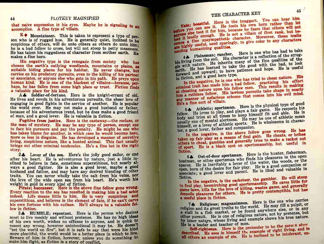 The title to this post probably does live up to itself--this bit, The Plotkey Magnified, by John Hamilton Curtis, reads as though it were written by a long-down-the-list loser of a Hemingway-imitation contest, and thunk-up with the vigor of a five-beer bar date. (Interestingly, the work, printed but not published in 1937, was prepared by the author for himself--we learn this info on the title page, along with the author's address, which was PO Box D, Eagle Rock, California.. It must've been a pretty small post office if their boxes were identified with letters.) The subtitle to this work pretty much sums it up: A Supplemetary Expansion of Curtis Magic Plotkey Combined with Slantng and Selling. The one thing that the author forgot was punctuation and grammar, which somehow shook themselves loose of his book, and which I'm guessing were sold in those now-disappeared tiny paper bags that you used to get at Reiman's Hardware store in 1966. He also forgot how to write, as some of his efforts are just truly bad, and occasionally painful. For example, we have the following exceptional declaration: