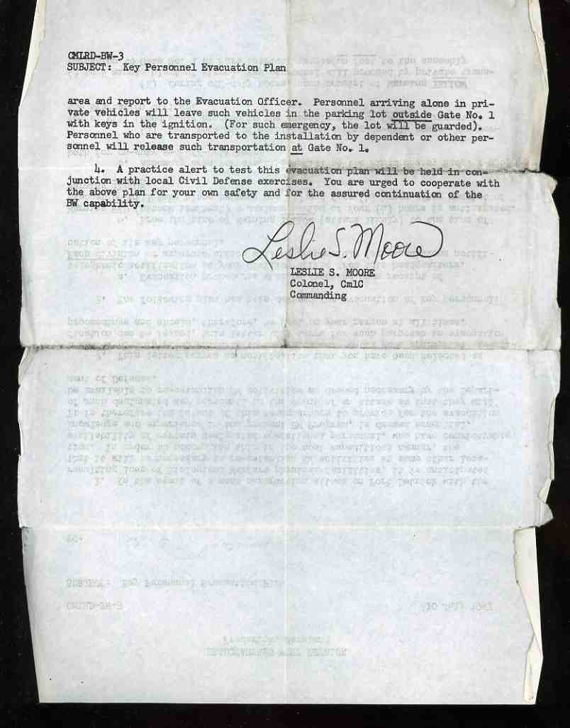 This letter, written in 1957 by Colonel Leslie S. Moore of the U.S. Biological Weapons Program at Fort Detrick, Maryland, to a member (whose name I've removed) of the "A.S."("Atmospheric Sciences") division, was basically a get-out-of-hell-free card for its bearer in the case of devastating nuclear attack.
