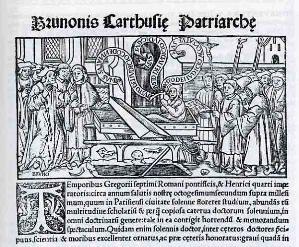 This example, printed in Paris in 1523, is an illustration for the work of Bruno Carthisienni. St. Bruno (who lived ca. 1030 to 1101) born in Cologne and educated in Rheims, was an influential academic with a wide accumulation of knowledge and a wandering spirit he used to establish monasteries. This woodcut is one of the earliest examples of word balloons in a printed book, while the book itself is a monument to typography and illustration. The word balloons in this case are really quite lovely, and seem to almost life their speaker from his casket.