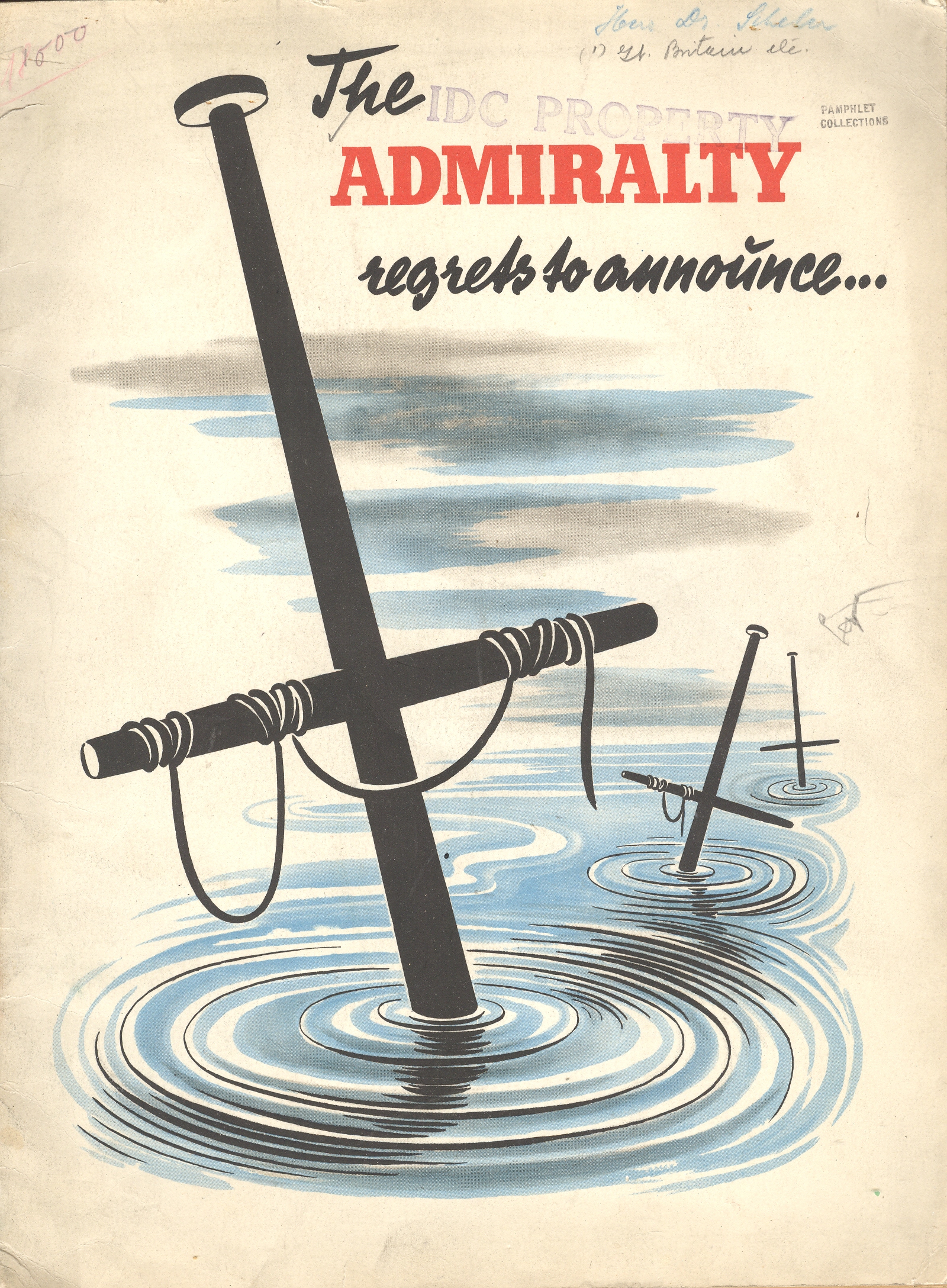 The Admiralty Regrets to Announce… was for years the standard beginning to an official British announcement concerning the loss of ships and sailors. The phrase is used as the title to this work (by an unattributed writer known only as “an expert”) to immediately introduce the reader to the failings of the British navy. It is of course a piece of Nazi propaganda, issued some time in 1941. (My copy is he U.S. copyright deposit copy and is stamped with a transfer date of September 1942; the pamphlets reads to me as though the U.S. had not yet entered the war.) The great strengths of the German air force and navy are extolled and the failings of the British mercantile elaborated at great—and sometimes greatly imagined—lengths. The booklet was published in French (except for the title) and answers its own repetitive question: “quelle est donc la situation relle de la marine commerciale anglais?”