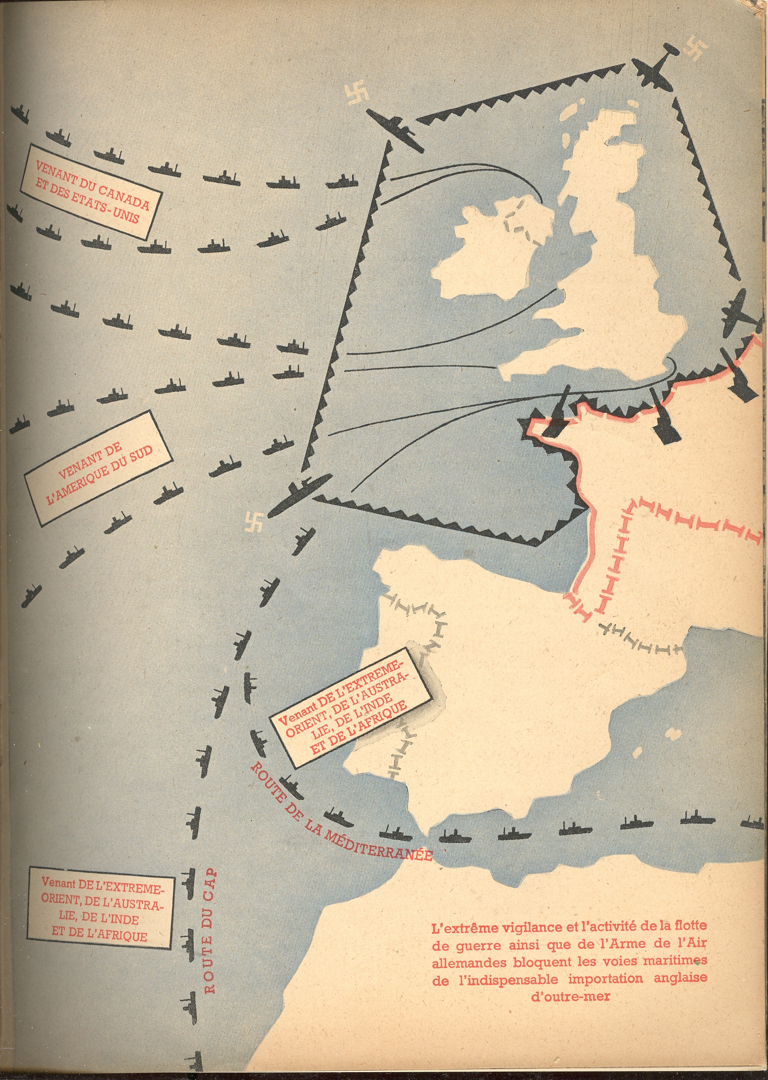 In the map at right we see the ports and shipping centers that were bombed by the Luftwaffe (with London located by a big red dot). Another map shows the stockade-like presence of the Nazi navy securing its impregnable wall against the arrival of foreign trade and supplies to Britain.