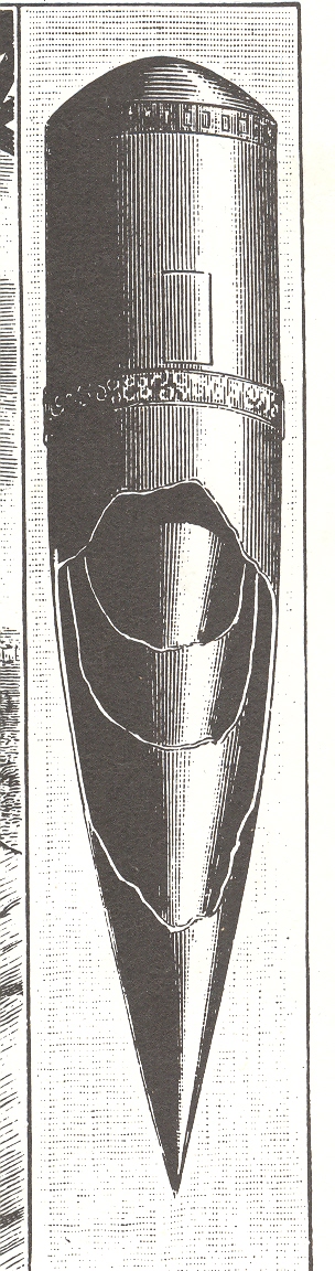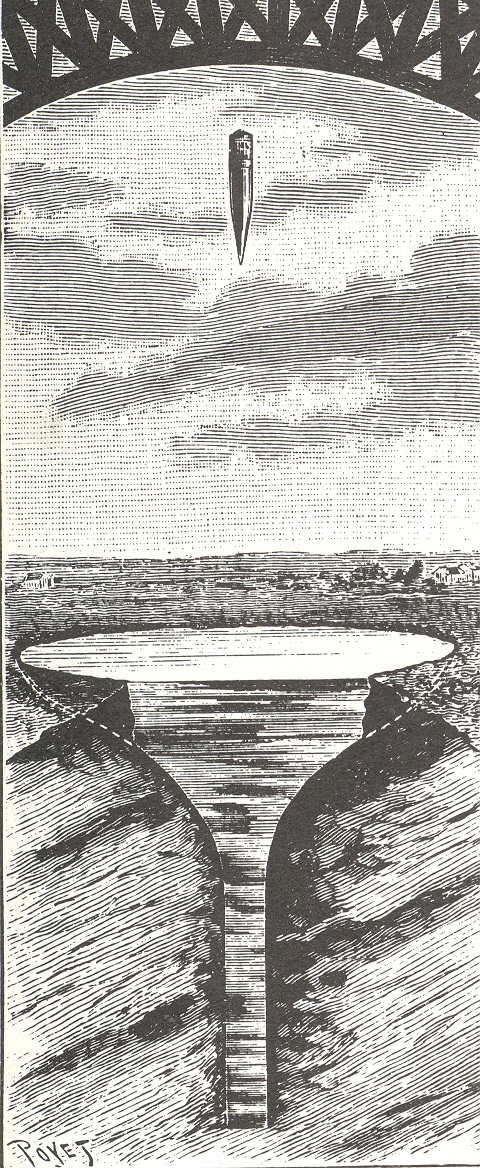 This is certainly a singular insight. But in 1891 it represented something a little more than just giving people a thrill ride. Physics of impact aside for the moment, M.Carron’s bullet capsule would be released from the top of the interior of the Tower, about 1000 feet high, and released to fall into an excavated pool 150’ across and 200’ deep. The idea was that in addition to the springs inside the capsule, the water would act as a “shock absorber”, and so “the shock felt by the occupants on landing will be in no way unpleasant”.