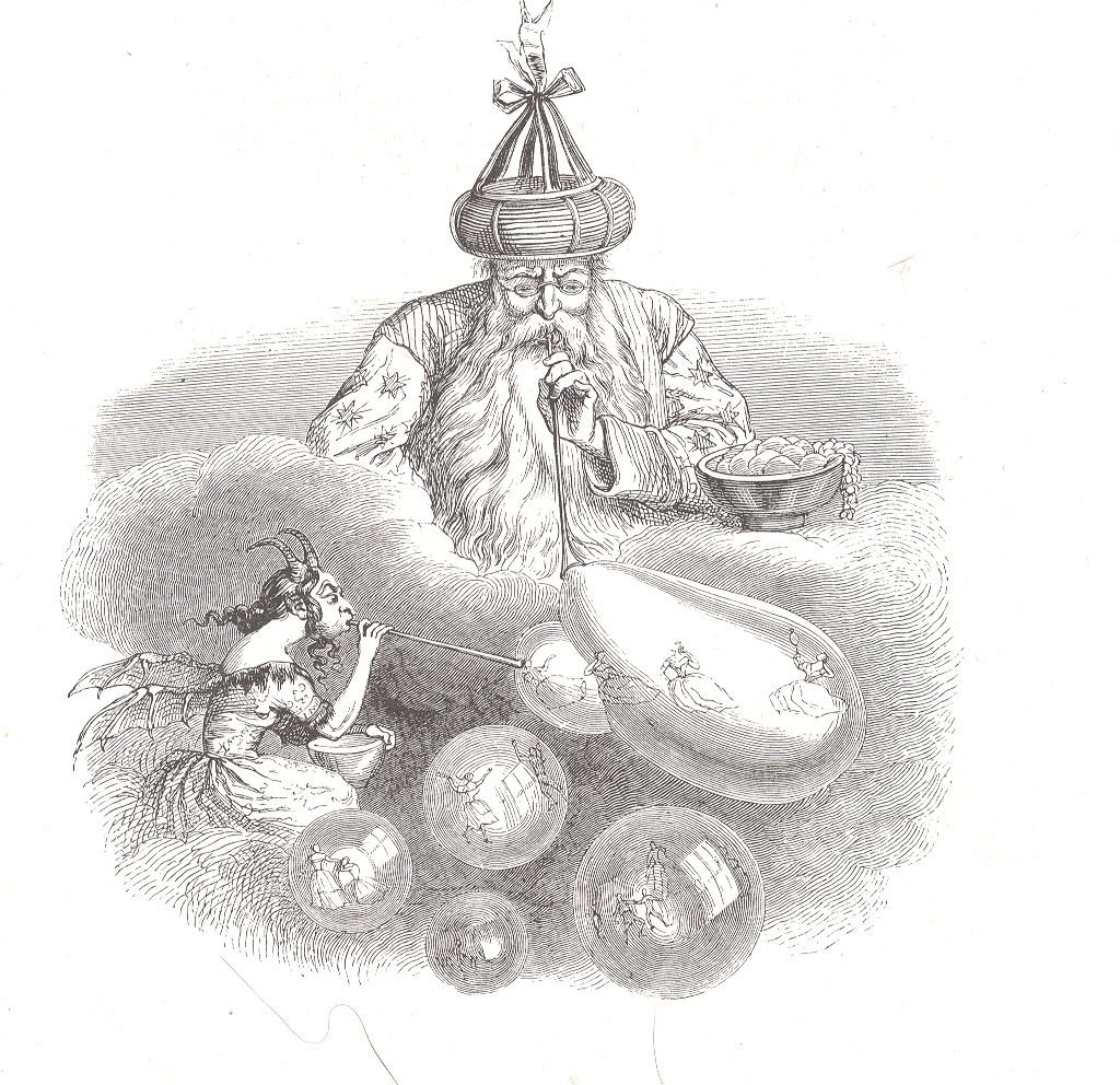 This being said, I have a special interest in the astronomically-based images that he produced, and so far as I can tell, there weren’t many of them in his vast output. In chapter 25 (“The Mysteries of Infinity”) of Un Autre Monde Grandville rolls out the great maker of the universe, the Primum Mobile, the Motive Force, the First Mover. The old scamp was busy and on display for Grandville’s character Hahbble, who floats around in the cosmos, and comes face-to-face with what in the end is Einstein’s dice thrower, as much as the great physicist didn’t want him to be, nor is he subtle (Raffiniert ist der Herr Gott, aber boshaft ist er nicht!) The malicious (“boshaft”) part would be supplied by someone else looking intent and dangerous, while the great maker turns out to be a magician who is happily creating the matter of all stuff by making it all out of bubbles.