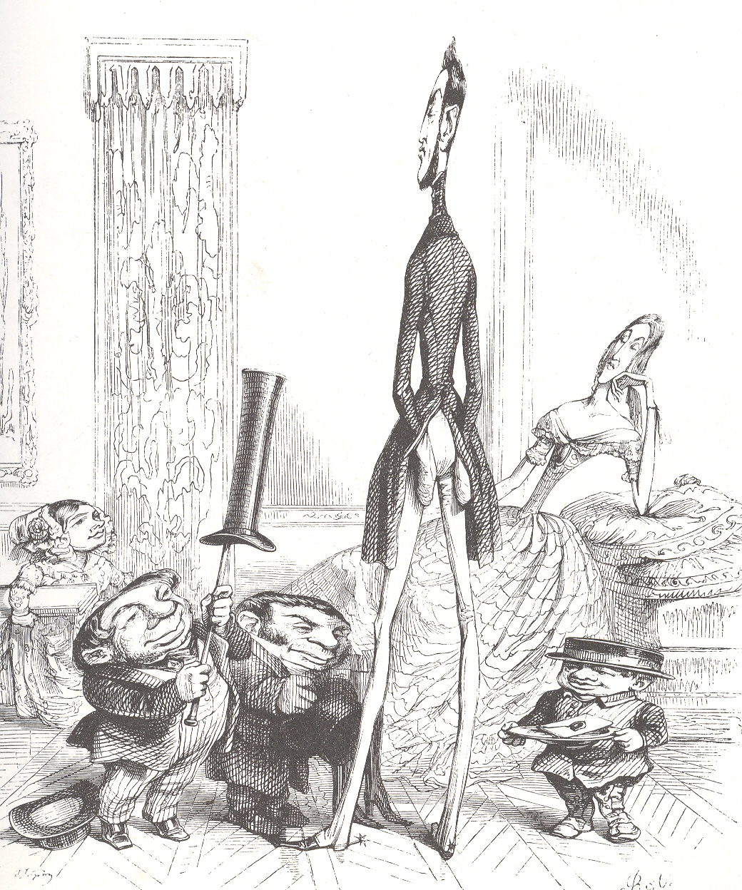 Last year I wrote a little aboutJ.J.Grandville’s interplanetary bridge connecting some of the planets (and including a balcony constructed of Saturn’s ring [sic] in an early Victorian Grad Tour solar system walkabout. Grandville (the pseudonym of Jean Ignace Isidore Gérard, born in 1803 and staggering too quickly out of life in 1847) was an extraordinary talent working somewhat out and ahead of his time; he had superb visions of the future, and of the past, and most of them were fantastic and fanciful, though not without some very stinging social commentary. He has been called a proto-Surrealist and I’d have to agree, though for me he had a larger production of social commentary in his work than any of the “real” Surrealists of the 20th century. For example, in his Un Autre Monde ("Another World") he depicts people’s social stature literally—the taller and thinner, the more socially important; the shorter and stouter, the more disposable/replaceable; the images are funny, convincing and wincingly penetrative.