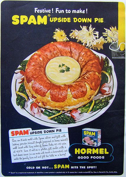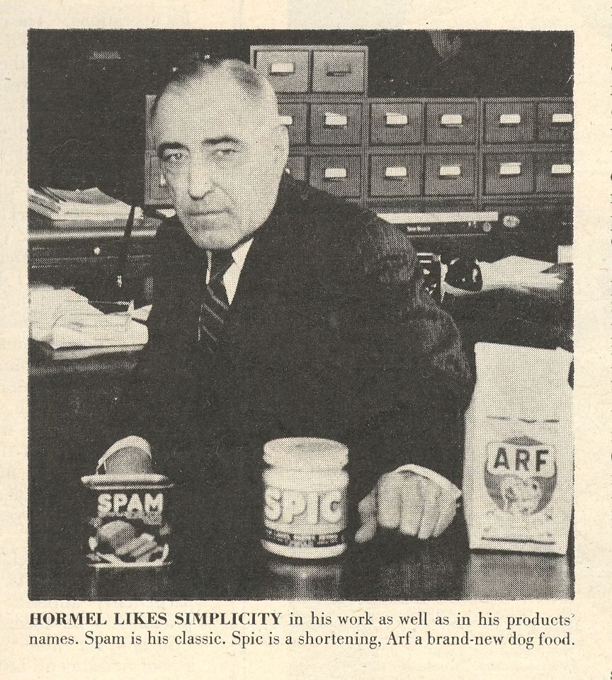 Joe ran his father’s “butcher business” and brought Spam to the world in 1937, trying to find an end run around the shrunken Depression food allowances, and pretty much succeeded.(Spam may also have been the first “singing commercial” in what the LIFE article called “the earthiest, corniest and most successful campaigns in U.S. advertising history.”) When the meat shortages spiked during WWII, Spam found its way overseas via Lend-lease arrangements, feeding millions of British and European people.. The consensus was that Spam was mysterious and unpretty, but did deliver something like 15-grams of protein per tin, which made it some sort of factor in waging the successful war. US soldiers also received smeats called “spam” though they weren’t necessarily Hormel’s product—just another in a long line of monosyllabic imitators whose quality and zestyness didn’t come close to the real thing, though this time prepared in the millions of pounds by Army cooks who banked on the Spam name more so than the actual preparation. Or so I read. In any event it was a real issue for Hormel who “insisted that Spam was a high-grade compound of ham and pork shoulder” and that the [real] “dainty, tasty Spam retained liquids in the meat, whereas the bulky Army preparations was guilty of the worst sin the in the tinned meat world…” floating away in “loose juice”. As a vegetarian, neither sounds very appetizing. And the anti-Spam stories and songs and newspaper articles and art and editorials of complaint and disgust coming from US soldiers during the war are endless and legion and iconic.