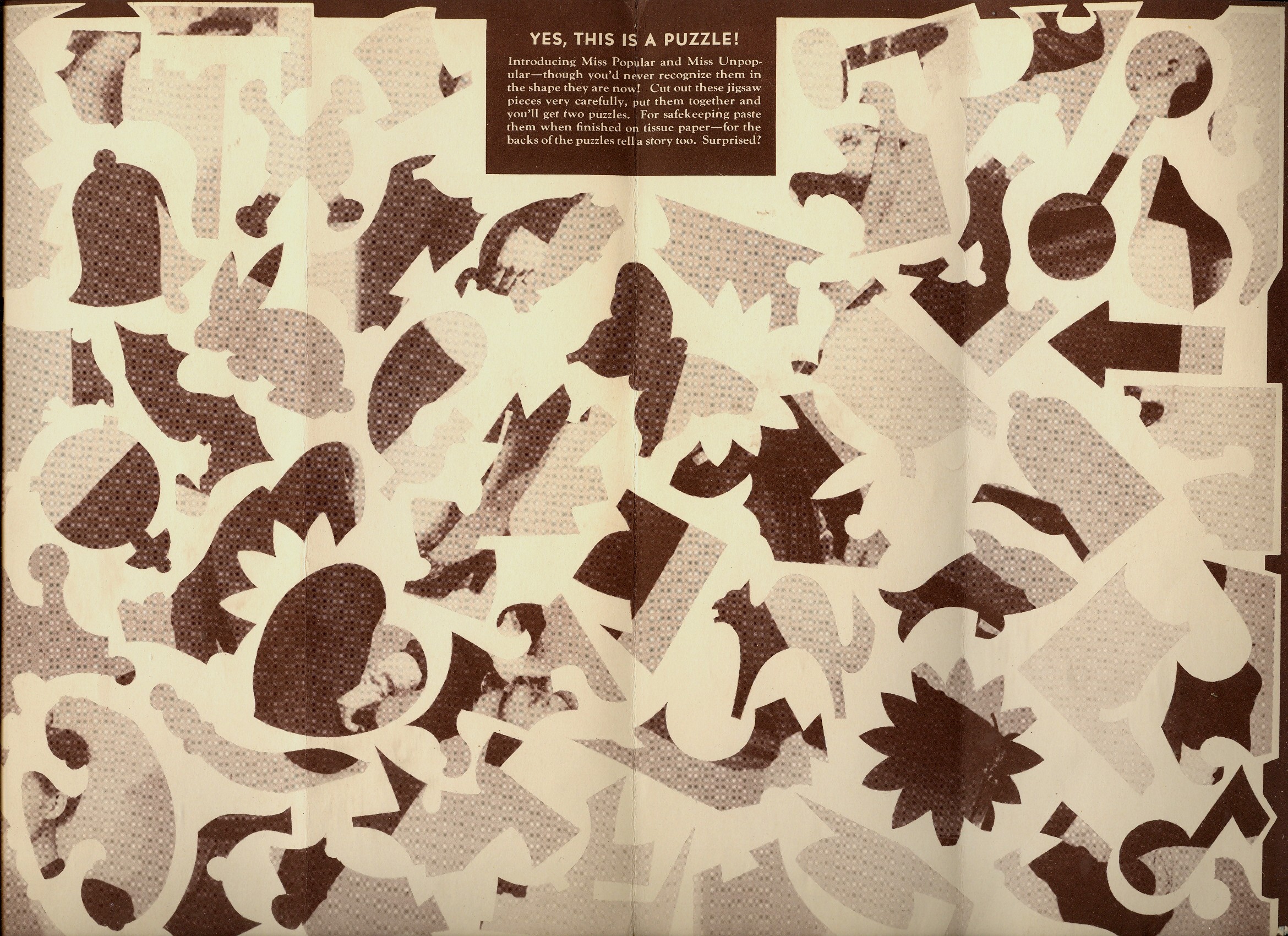One of these publications—hardly a pamphlet per se, just a folded 11x8 inch sheet of heavy stock—came without a title, presenting itself as a puzzle. The puzzle pieces are parts of two women, “Miss Popular” and “Miss Unpopular”: the reader was to take the publication, cut out the pieces, and reassemble them into hidden role models, with phrases describing each on the back of each puzzle piece, all done without the slightest possible understanding of metaphor or irony.