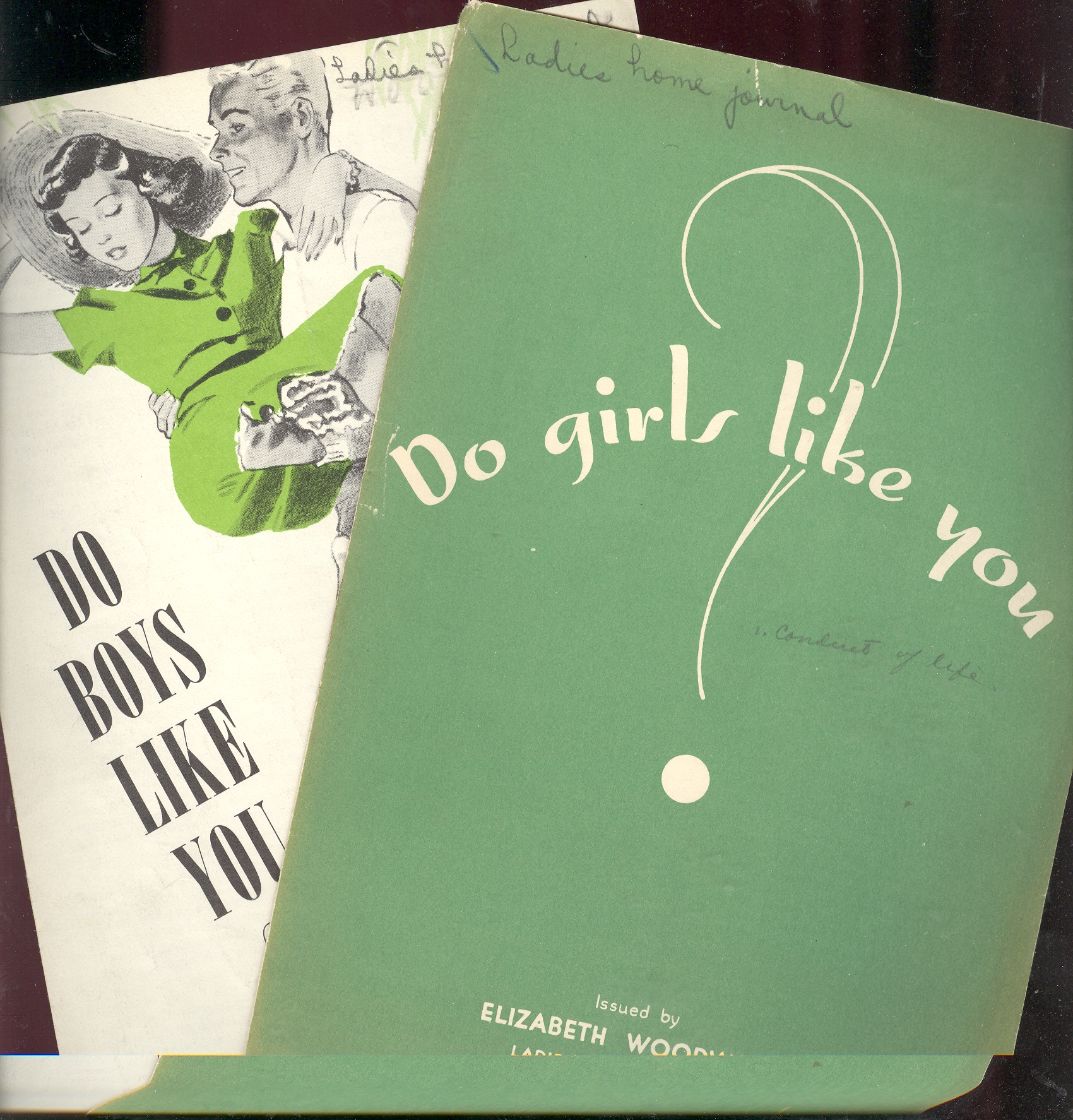 Who IS this Elizabeth Woodward anyway? I think I like the "Behave Yourself" cover best, although the "Do Boys Like You?" Ken-doll gathering her folds in to his chivalrous fist is touching. I'm afraid he would be in a different lifestyle today. I printed the How to Rate Another Date list to discuss over tea tonight at home ...