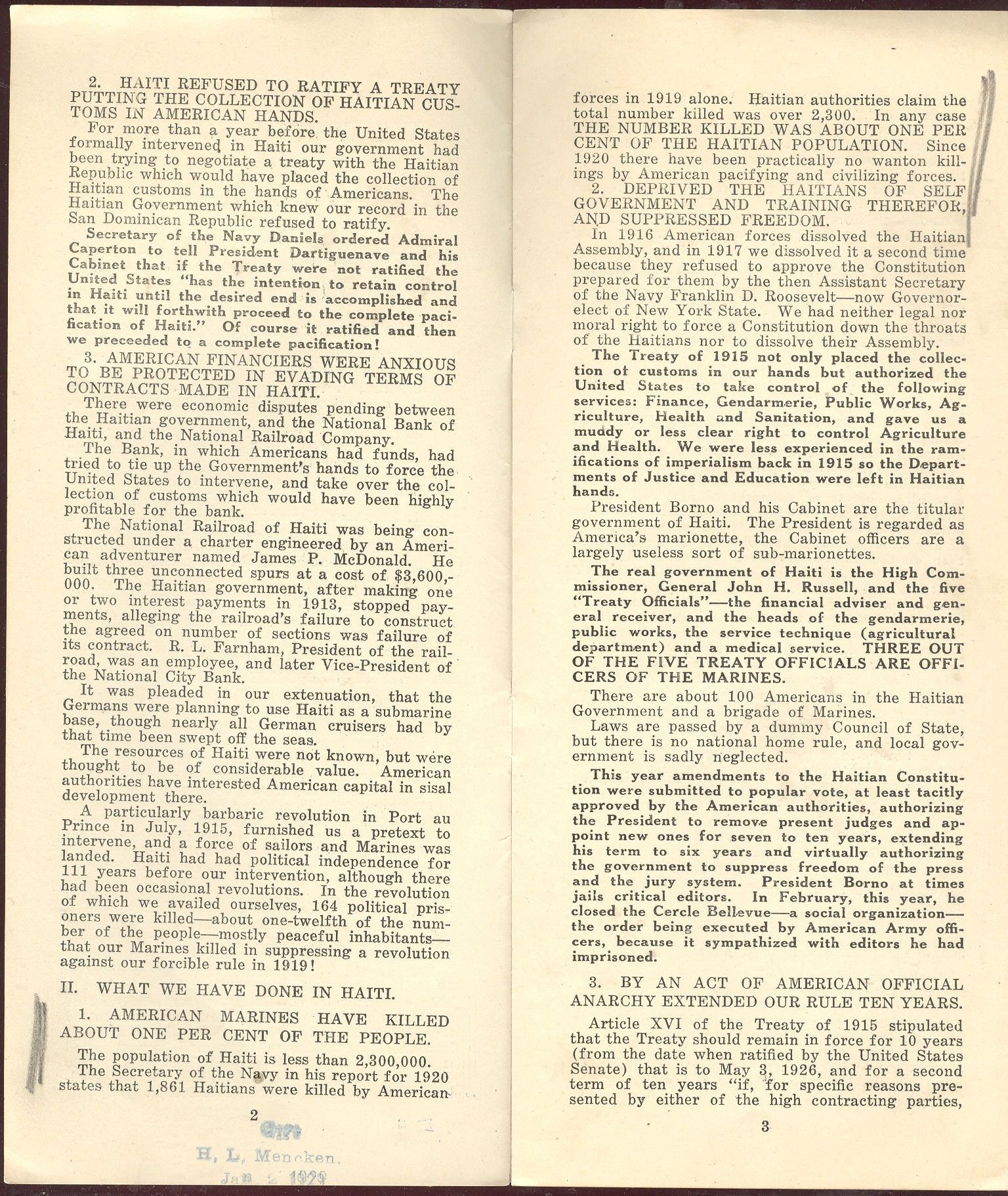 This small pamphlet (reprinted below in continued reading)--printed in 1929 and once owned by H.L. Mencken, and with his annotations--is a gonzo screed against American imperialism in Haiti produced by "The People's Lobby" and headed by Prof. John Dewey.2