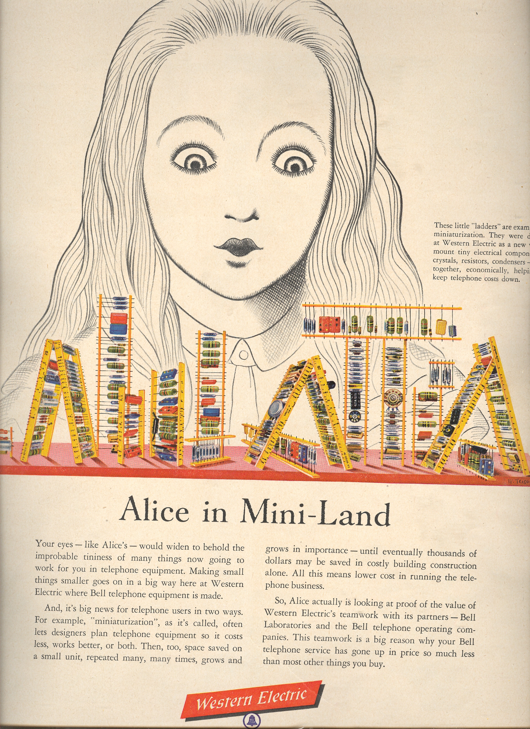 A great advertisement using Alice appears in LIFE in 1954, an early ad from Western Electric for microminiaturized electronics. So far as I can tell this is one of the very earliest popular ads for what will absolutely revolutionize the country over the next thirty years.