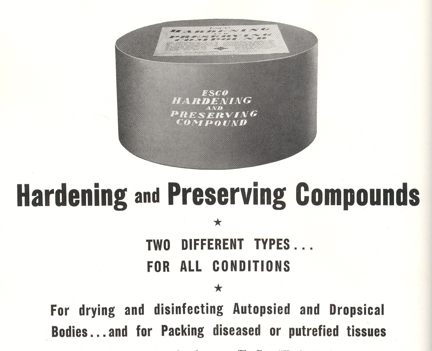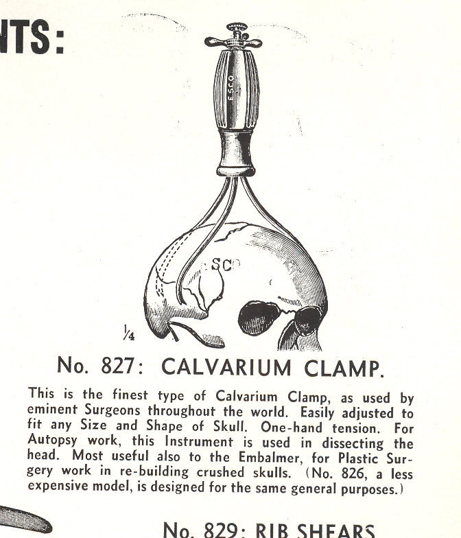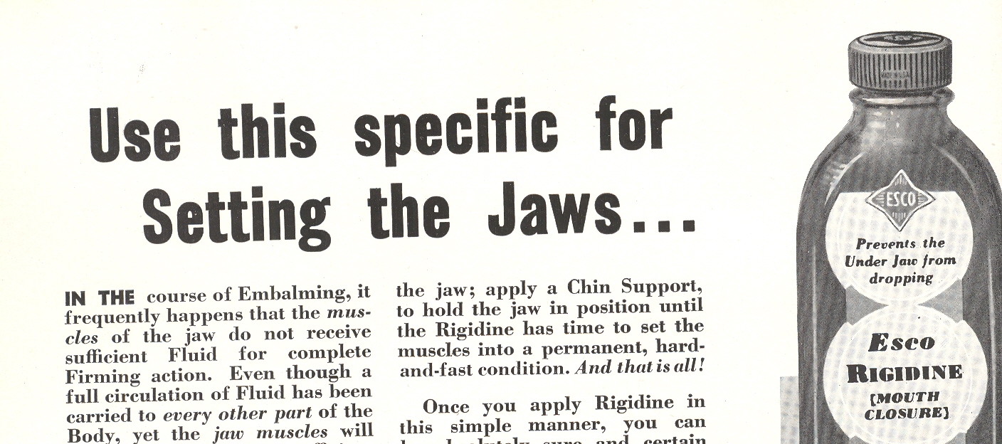 This carefree stroll through the geology of death prep and care comes to us via the Embalmers’ Supply Company (ESCO) catalog, of 1941, serving and selling to members of the embalming profession since 1886. It provides the Practioner with all means necessary to scrape away facial muscle, cement the jaw, seal the eyes, color “old age” eyebrows, fill cancerous cavities, mold over gaping wounds, position the arms, contour the chin, scoop out the brain, replace the blood, pull out the bowels, and all other manner of removal/drainage/fillup, and then apply makeup to cover all suture wounds and other “deficiencies”.