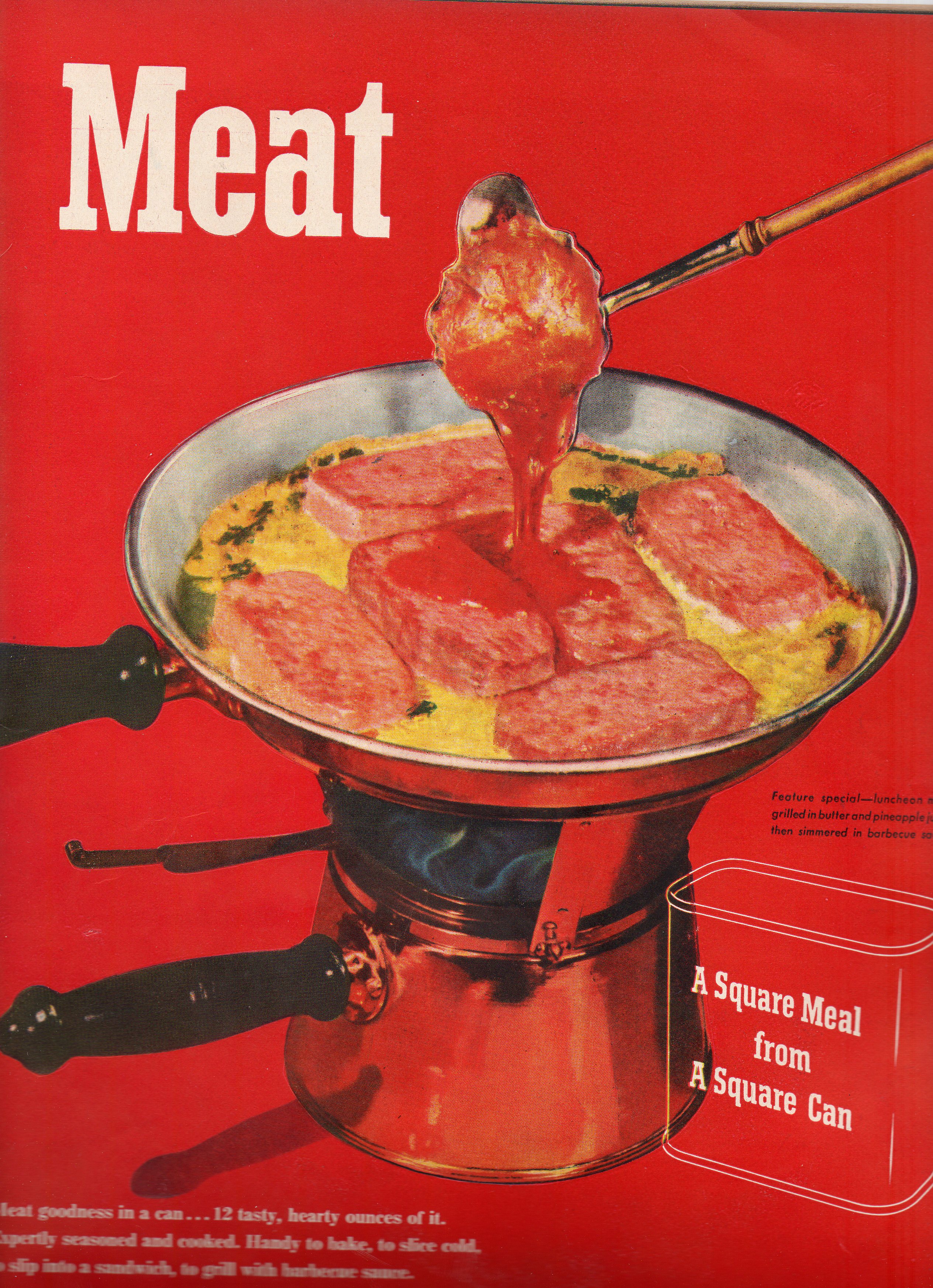 The category of the specialty meat, the meat that both is and isn’t meat, is one that holds a particularly high place in the religico-belief system of consumption in America—and particularly so in the historical American meat memory. For it is here, in this very purply ad in LIFE magazine in July 1947 that we find a reminder for a meat product being sold as such, printed with the statement that the meat is being sold with meat in it, which is odd because it suggests the rejoinder that the opposite is true, too.