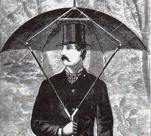 was this simple umbrella to protect the hat. It reminds me of the utility of a portable pocket-sized mustache guard. I wonder if you were expected to carry an umbrella to protect the rest of your body? Or another to protect the umbrella that was protecting the hat umbrella? (Tortoises all the way down....) Still, though, this is a great drawing with applications far beyond the reach of a simple hat protector.