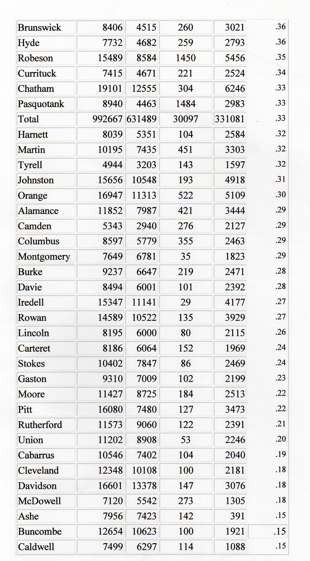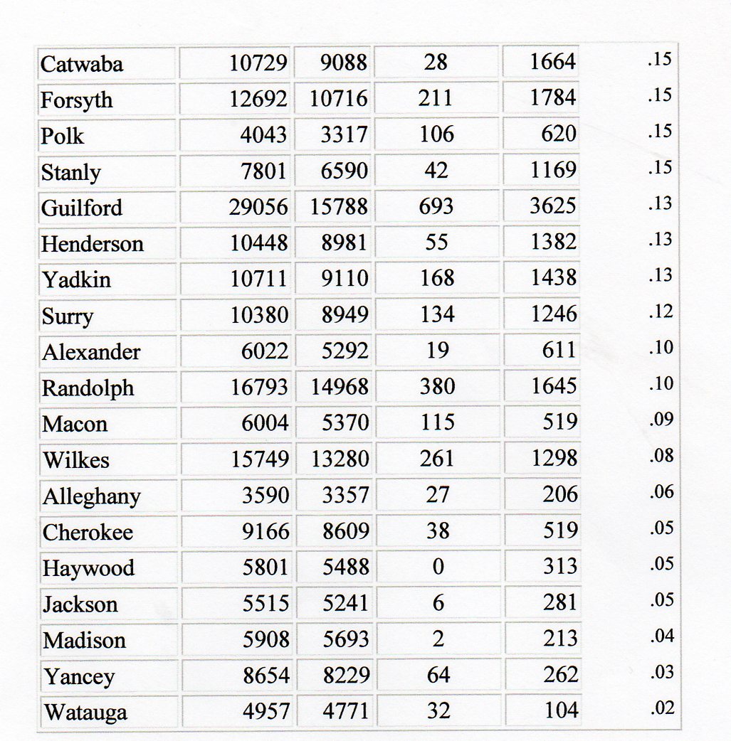 In case my first comment was lost, I noted the typo on the map for Union County, listing it at .82. The table cleared it up, listing it at .20 which is in line with its neighbors north and west.