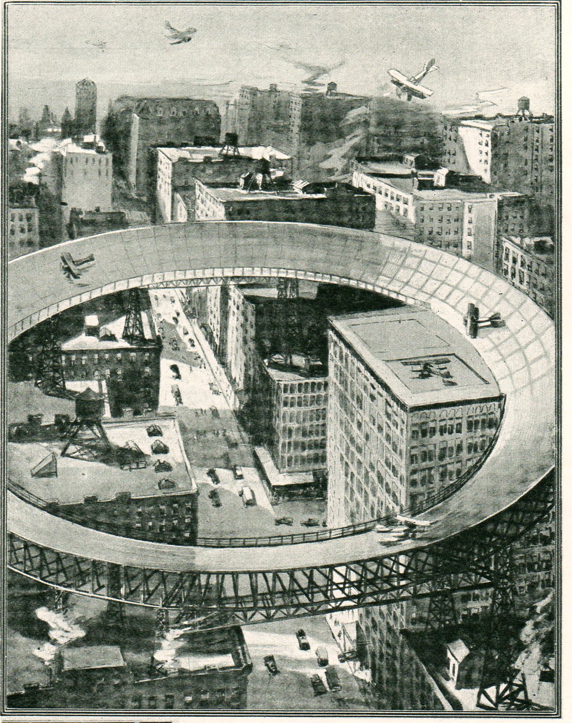 This is a prototype, of sorts, for many dozens of proposals that would appear in magazines like Science and Popular Science and Popular Mechanics and so on, suggesting inner-city airports that could be easily accommodated by the city bustle by placing the airport on top of buildings (as above), and these other closely-related ideas (below):