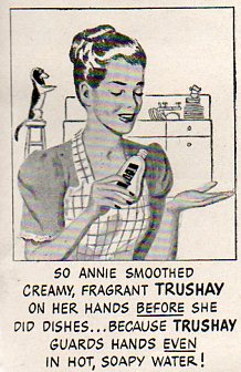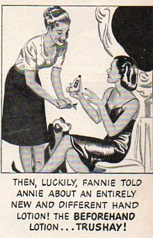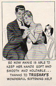 Retroist excursions like this into the land of social propriety from not so long ago is a bittersweet thing--its concerns can remind of of how far away from something we seem to be, when in reality that distance in time and space just isn't very far away at all; it is just slightly different, renamed and repackaged. For example, this advertisement from LIFE magazine for Trushay hand softener (1954) delivers pretty much the same message as most similar products today, except for the change in packaging and less obvious message. The message may seem outdated but I think only in so far as the images and clumsiness of the delivery is concerned. Products like this have increased by orders of magnitude, the target audiences age seems to have dropped considerably, and most of the time the pursuit of this 1954 end-result stays pretty much the same. Exercises like this are peculiar, and can show us that the people who we are laughing at may very well be us.